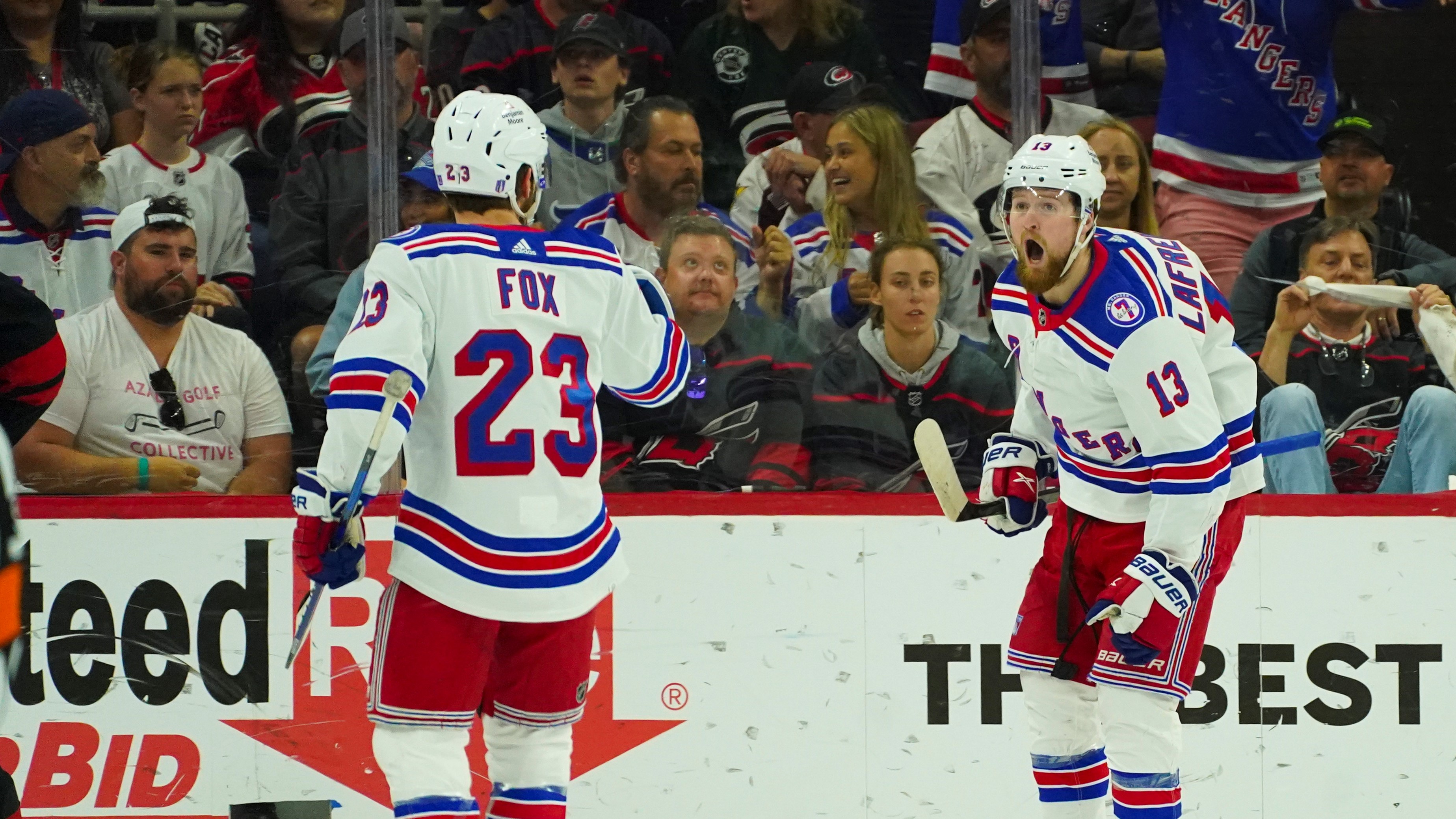 May 30, 2022; Raleigh, North Carolina, USA; New York Rangers left wing Alexis Lafreni re (13) celebrates the goal scored by defenseman Adam Fox (23) goal against the Carolina Hurricanes during the first period in game seven of the second round of the 2022 Stanley Cup Playoffs at PNC Arena. Mandatory Credit: James Guillory-USA TODAY Sports / James Guillory-USA TODAY Sports