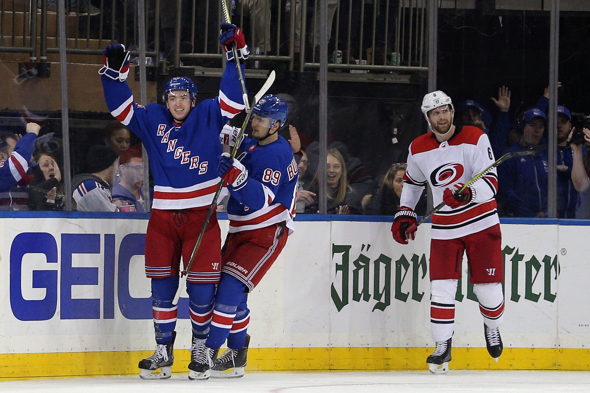 Mar 12, 2018; New York, NY, USA; New York Rangers left wing Jimmy Vesey (26) reacts with left wing Pavel Buchnevich (89) in front of Carolina Hurricanes defenseman Klas Dahlbeck (6) after scoring a goal during the third period at Madison Square Garden. Mandatory Credit: Brad Penner-USA TODAY Sports / Brad Penner