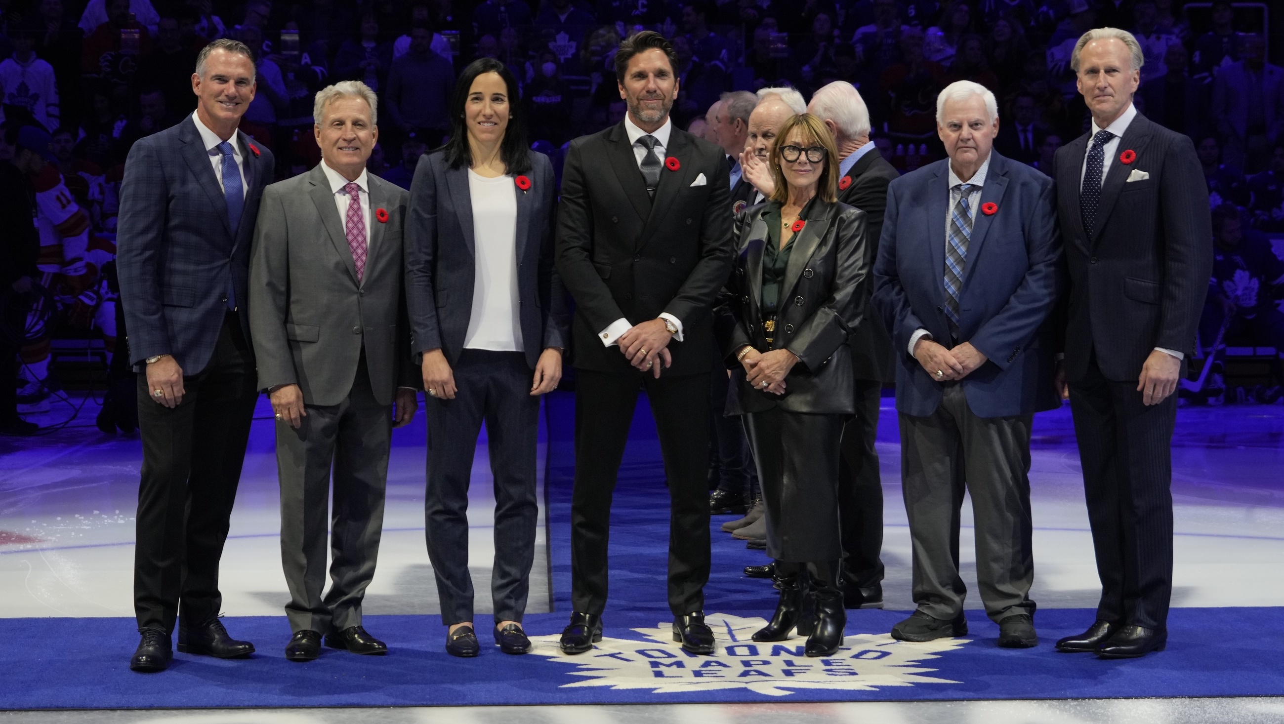 Hockey Hall of Fame Class of 2023 inductees Pierre Turgeon, Mike Vernon, Caroline Ouellette, Henrik Lundqvist, Coco Lacroix for her husband Pierre , Ken Hitchcock, and Tom Barrasso (left to right) before the start of the game between the Calgary Flames and Toronto Maple Leafs at Scotiabank Arena. / John E. Sokolowski-USA TODAY Sports
