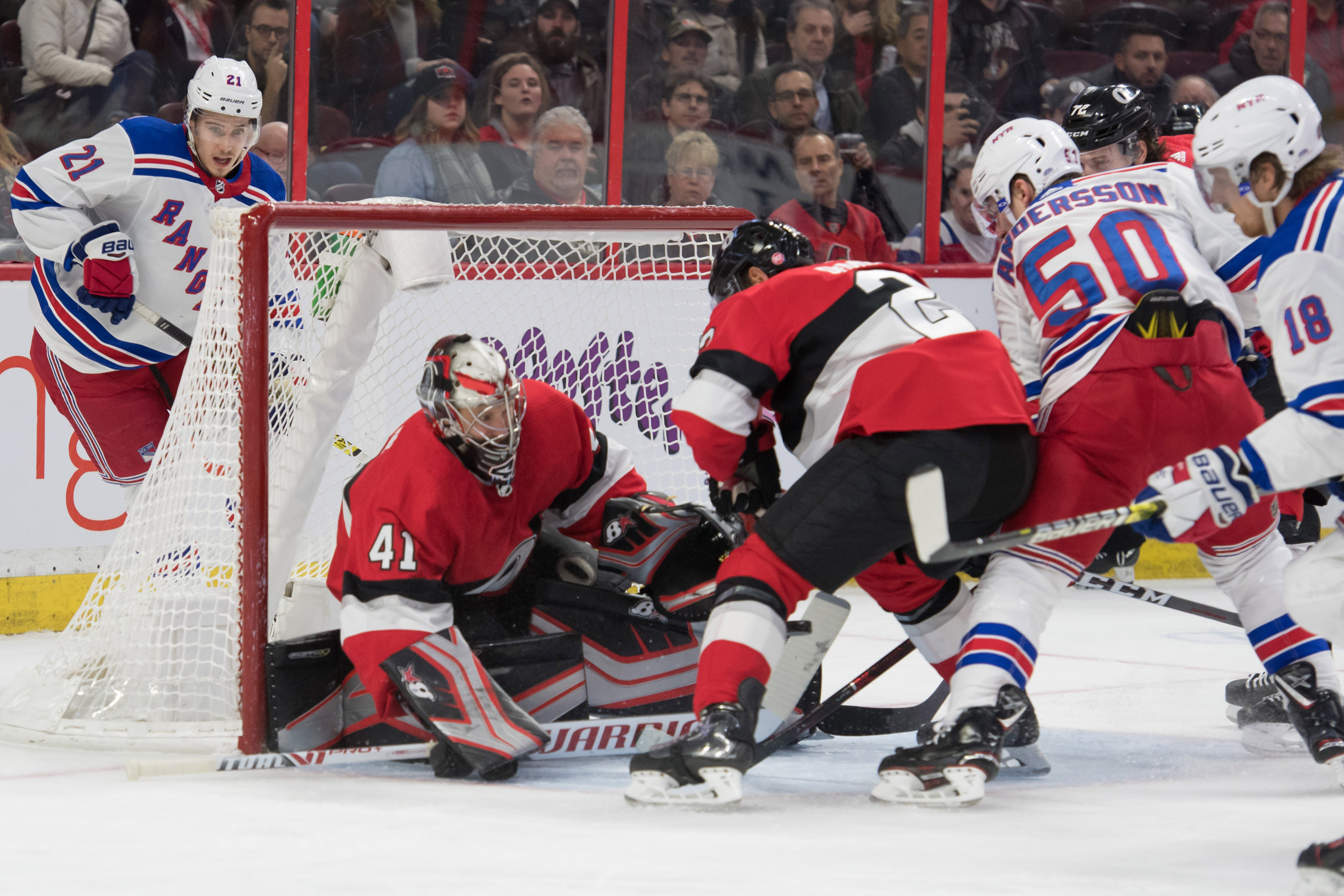 Nov 29, 2018; Ottawa, Ontario, CAN; Ottawa Senators goalie Craig Anderson (41) makes a save on a shot from New York Rangers center center Lias Andersson (50) in the second period at the Canadian Tire Centre. Mandatory Credit: Marc DesRosiers-USA TODAY Sports / Marc DesRosiers