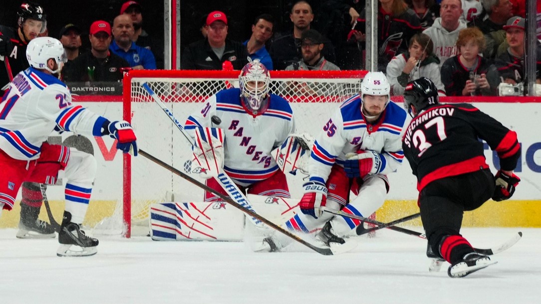 May 11, 2024; Raleigh, North Carolina, USA; Carolina Hurricanes right wing Andrei Svechnikov (37) shoots the puck against New York Rangers defenseman Ryan Lindgren (55) and goaltender Igor Shesterkin (31) during the second period in game four of the second round of the 2024 Stanley Cup Playoffs at PNC Arena. / James Guillory-USA TODAY Sports