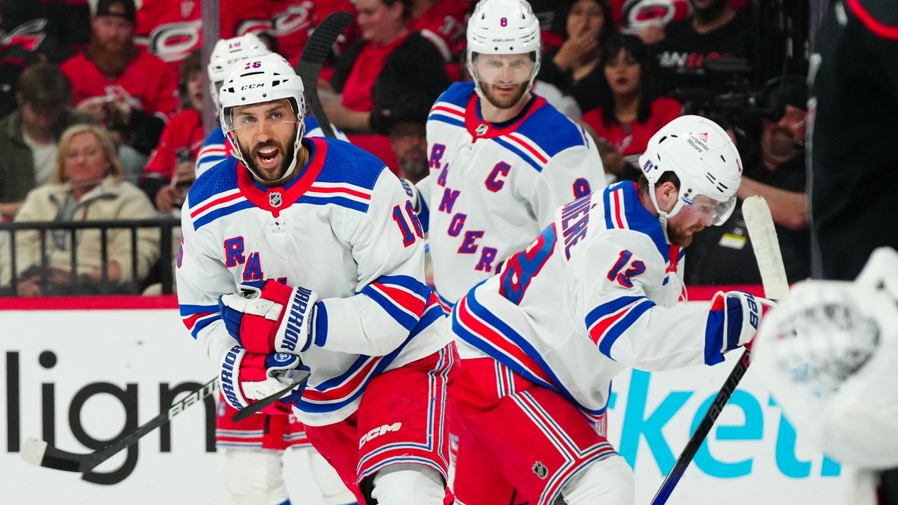 May 16, 2024; Raleigh, North Carolina, USA; New York Rangers center Vincent Trocheck (16) celebrates his goal past against the Carolina Hurricanes during the second period in game six of the second round of the 2024 Stanley Cup Playoffs at PNC Arena. / James Guillory-USA TODAY Sports