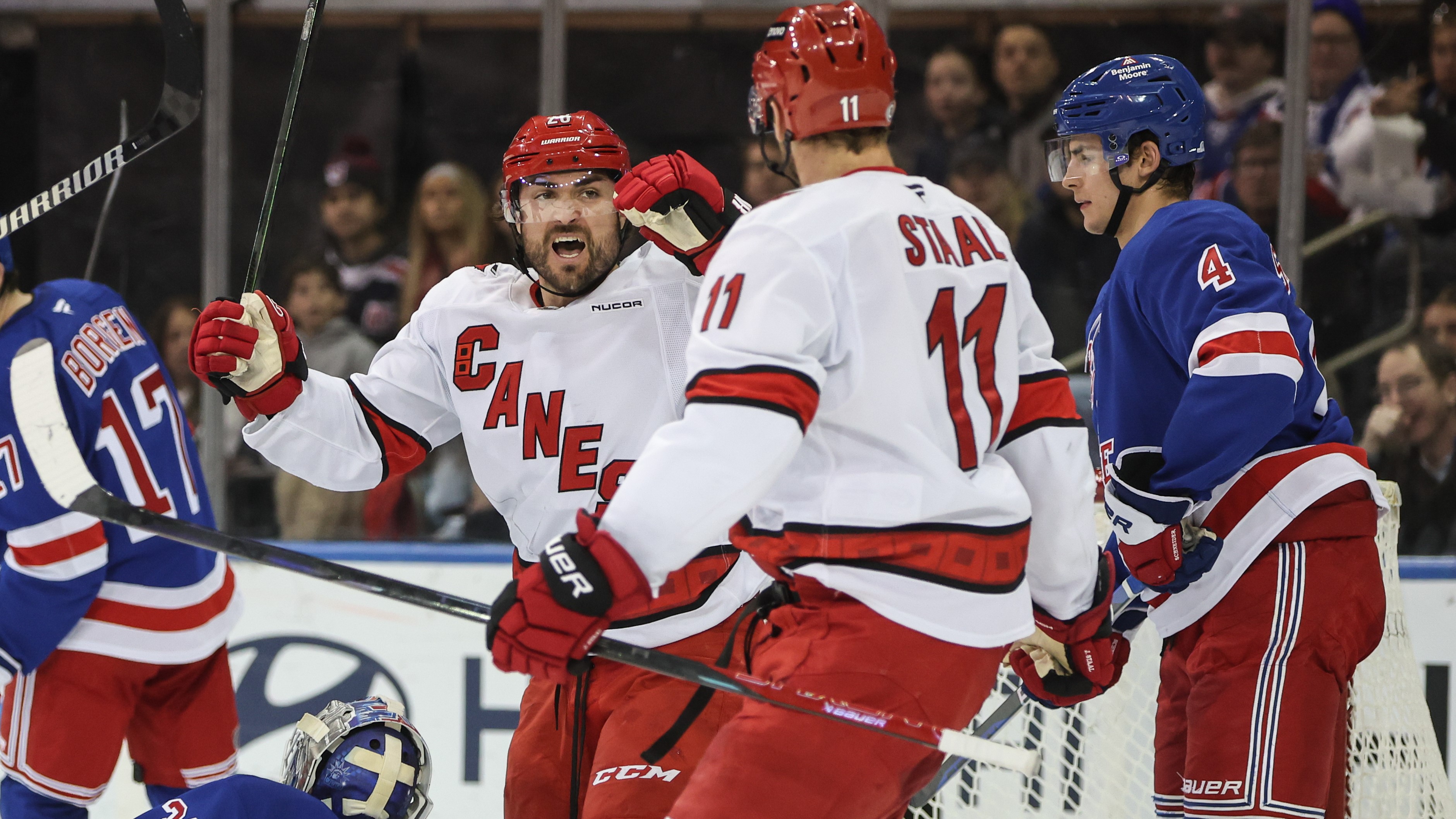 Rangers' 3-1 loss to Hurricanes drops record to .500 for first time in 2024-25 NHL seasonNew York allowed three unanswered goals12/22/2024, 8:45 PMAssociated PressDec 22, 2024; New York, New York, USA; Carolina Hurricanes left wing William Carrier (28) celebrates with center Jordan Staal (11) after scoring a goal in the second period against the New York Rangers at Madison Square Garden. Mandatory Credit: Wendell Cruz-Imagn Images / © Wendell Cruz-Imagn Images