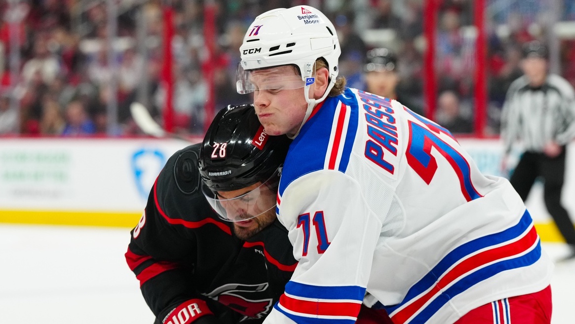 Rangers eliminated from playoff contention with 7-3 loss to HurricanesNew York misses postseason for first time since 20214/12/2025, 10:17 PMAssociated PressNew York Rangers center Juuso Parssinen (71) and Carolina Hurricanes left wing William Carrier (28) battle for position during the first period at Lenovo Center. / James Guillory-Imagn Images