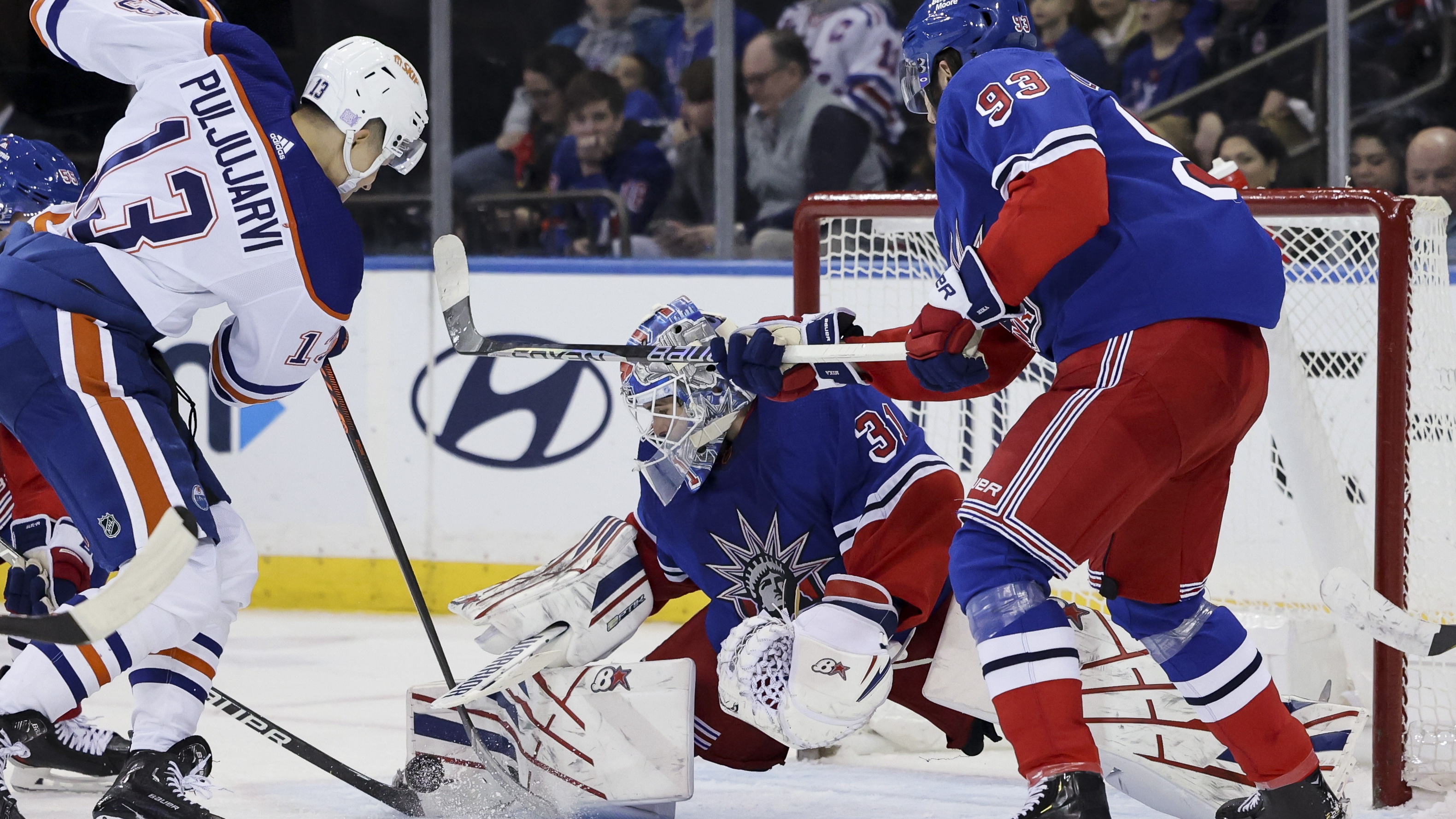 New York Rangers goaltender Igor Shesterkin (31) makes a save against Edmonton Oilers right wing Jesse Puljujarvi (13) as New York Rangers center Mika Zibanejad (93) watches during the second period at Madison Square Garden / Jessica Alcheh - USA TODAY Sports
