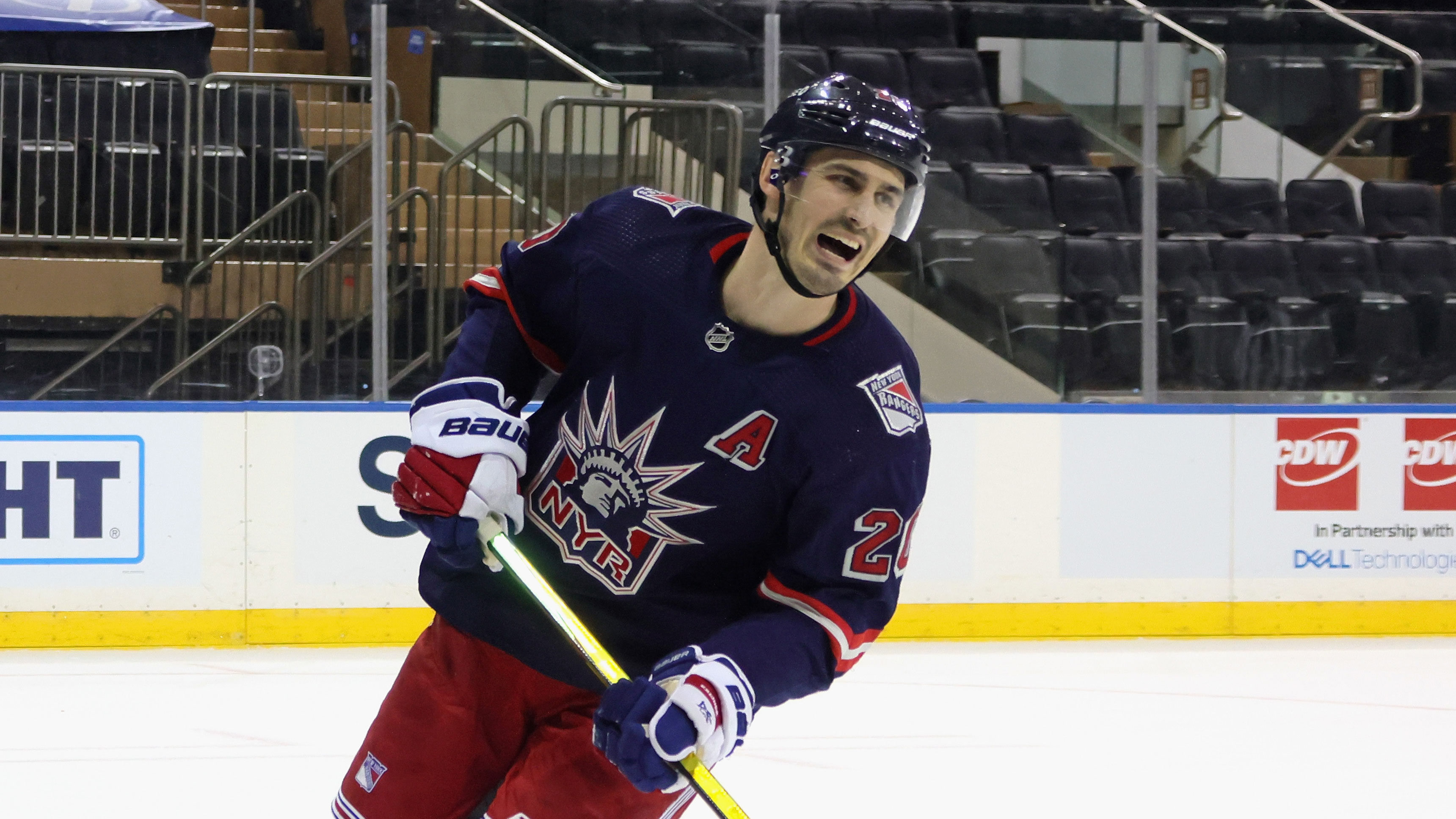 Apr 8, 2021; New York, New York, USA; New York Rangers left wing Chris Kreider (20) reacts after Pittsburgh Penguins goaltender Tristan Jarry (35) blocks his penalty shot during the second period at Madison Square Garden. / Bruce Bennett/Pool Photo-USA TODAY Sports