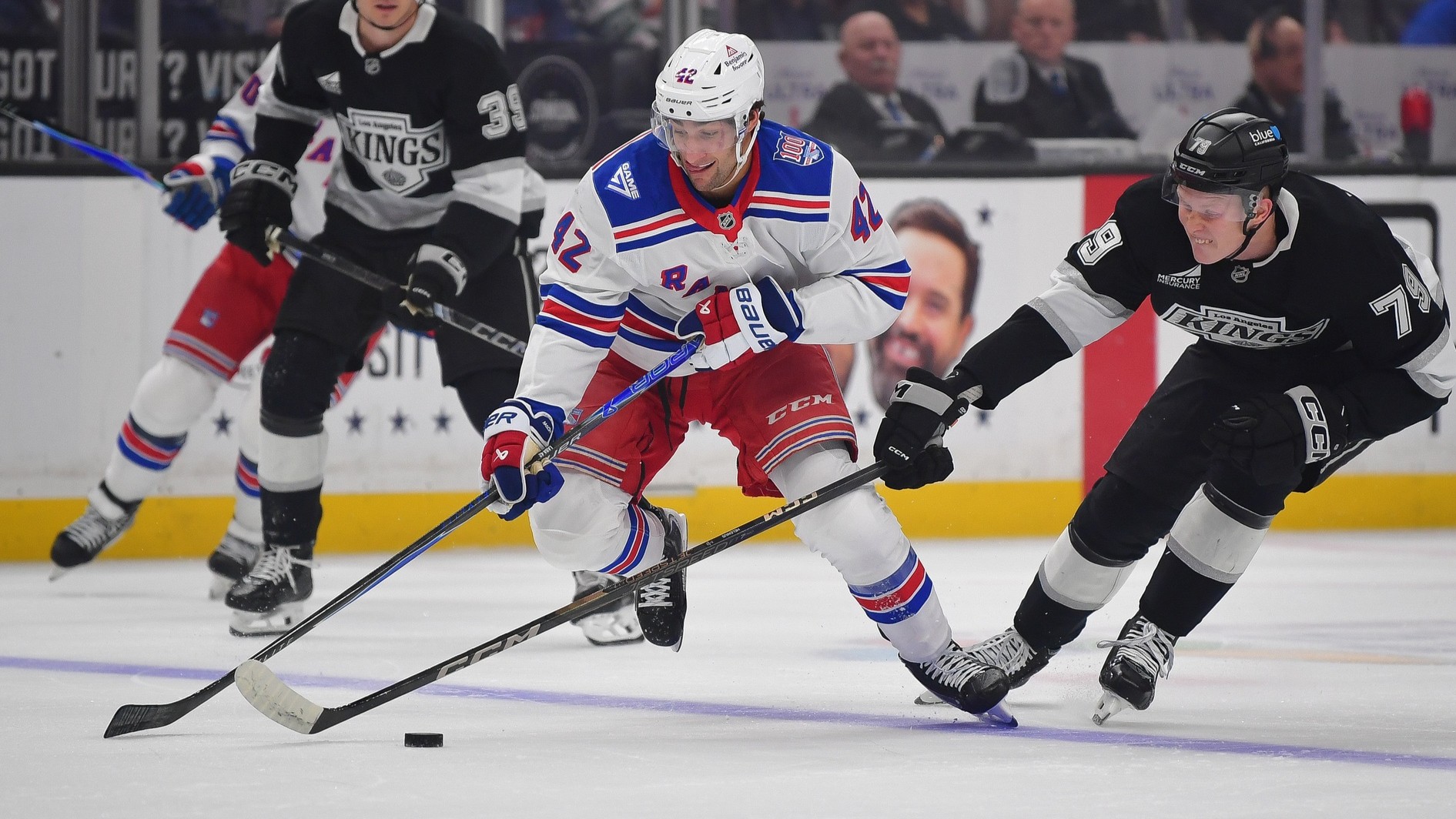 Rangers fall short despite J.T. Miller's two goals in 4-3 loss to KingsRangers have lost seven of last eight games1/21/2026, 6:05 AMAssociated PressJan 20, 2026; Los Angeles, California, USA; Los Angeles Kings center Samuel Helenius (79) plays for the puck against New York Rangers center Noah Laba (42) during the first period at Crypto.com Arena. / Gary A. Vasquez-Imagn Images