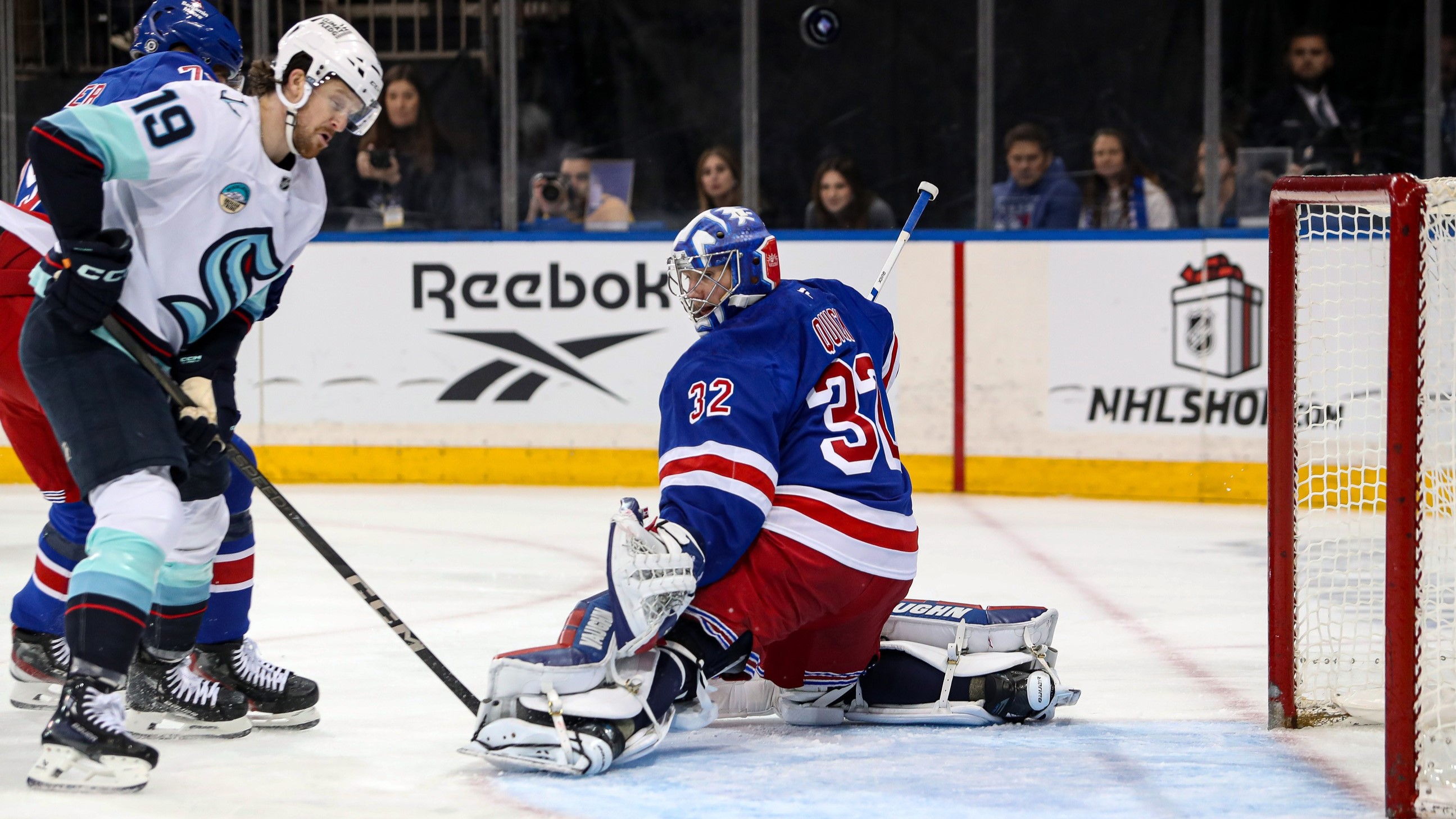 Jonathan Quick struggles in net as Rangers fall to Kraken, 7-5Veteran allowed six goals on 21 shots12/8/2024, 9:29 PMAssociated PressDec 8, 2024; New York, New York, USA; New York Rangers goalie Jonathan Quick (32) makes a save while Seattle Kraken center Jared McCann (19) fights for position during the first period at Madison Square Garden. M / Danny Wild-Imagn Images