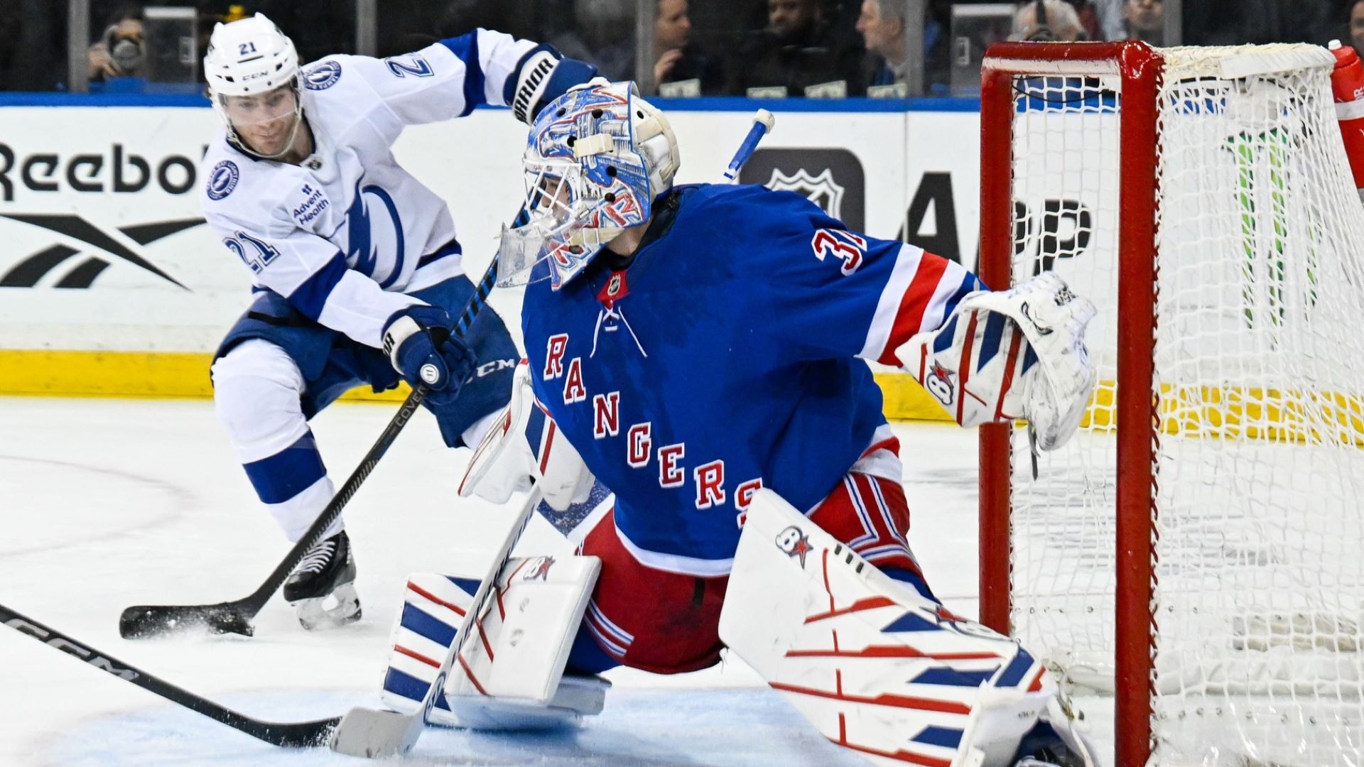 Apr 7, 2025; New York, New York, USA; Tampa Bay Lightning center Brayden Point (21) takes a shot and scores his second goal of the game against New York Rangers goaltender Igor Shesterkin (31) during the third period at Madison Square Garden. / Dennis Schneidler-Imagn Images