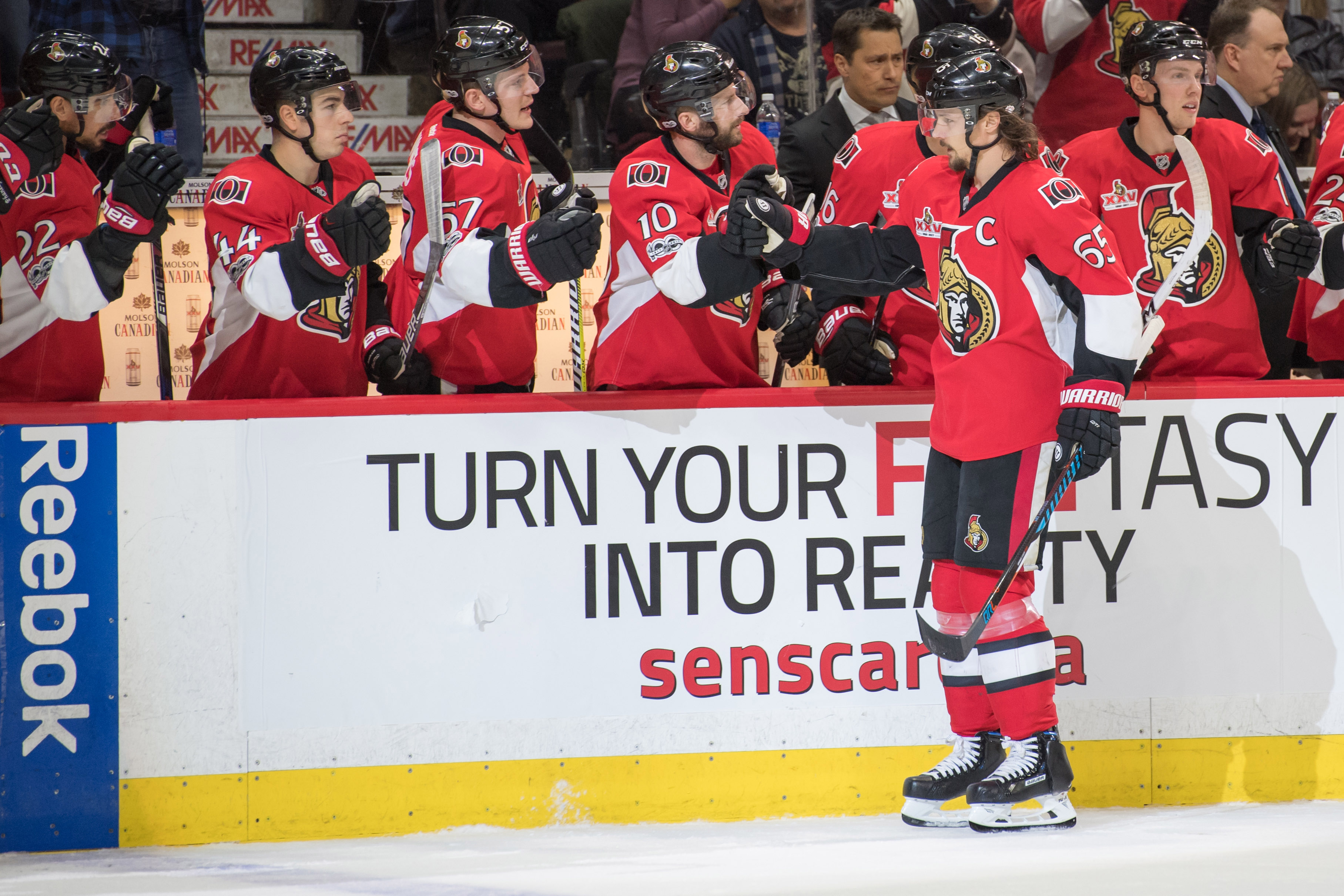 Apr 4, 2017; Ottawa, Ontario, CAN; The Ottawa Senators celebrate a goal by defenseman Erik Karlsson (65) in the first period against the Detroit Red Wings at Canadian Tire Centre. Mandatory Credit: Marc DesRosiers-USA TODAY Sports / Marc DesRosiers