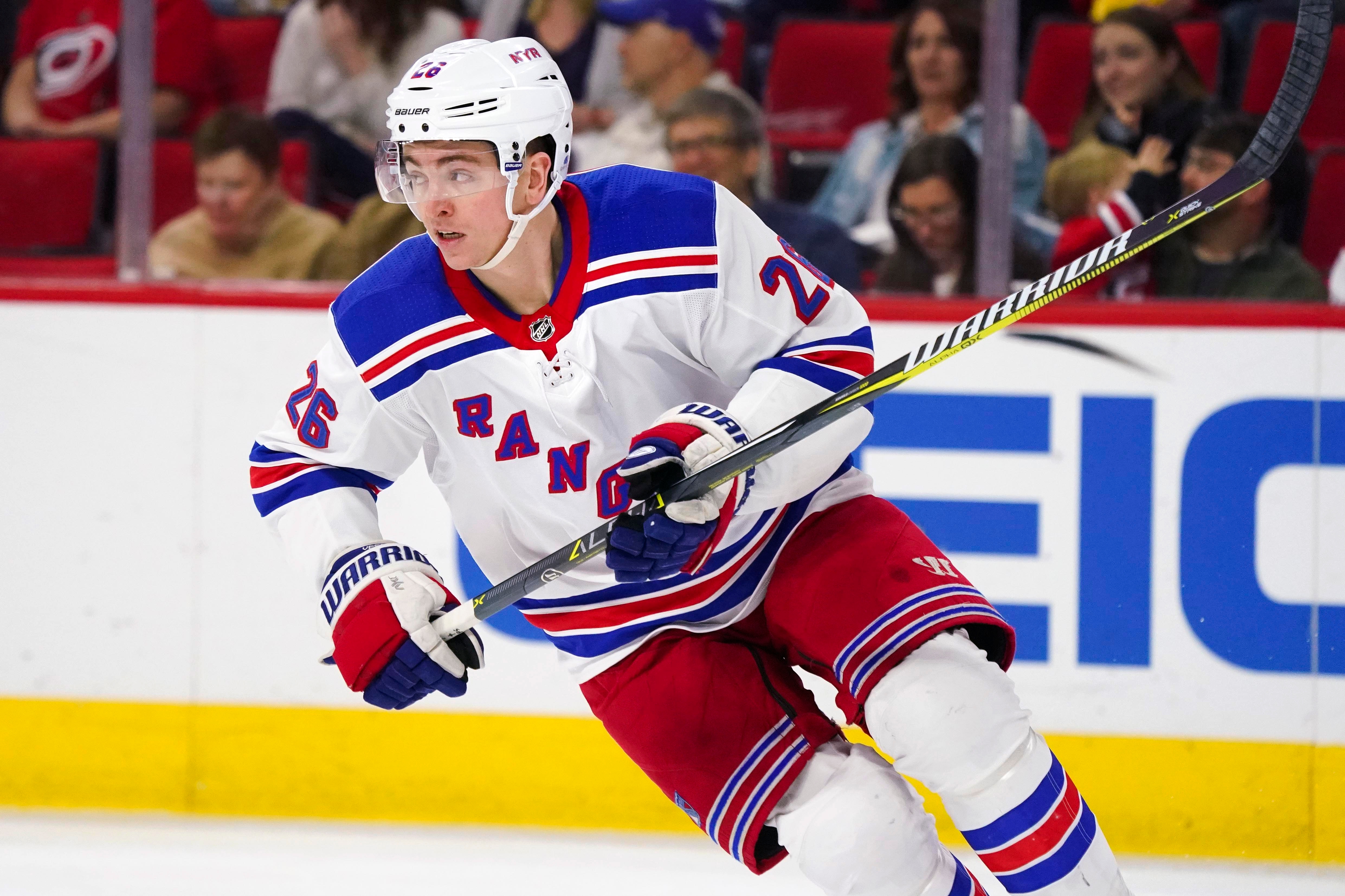 Mar 31, 2018; Raleigh, NC, USA; New York Rangers forward Jimmy Vesey (26) skates against the Carolina Hurricanes at PNC Arena. The New York Rangers defeated the Carolina Hurricanes 2-1. Mandatory Credit: James Guillory-USA TODAY Sports / James Guillory