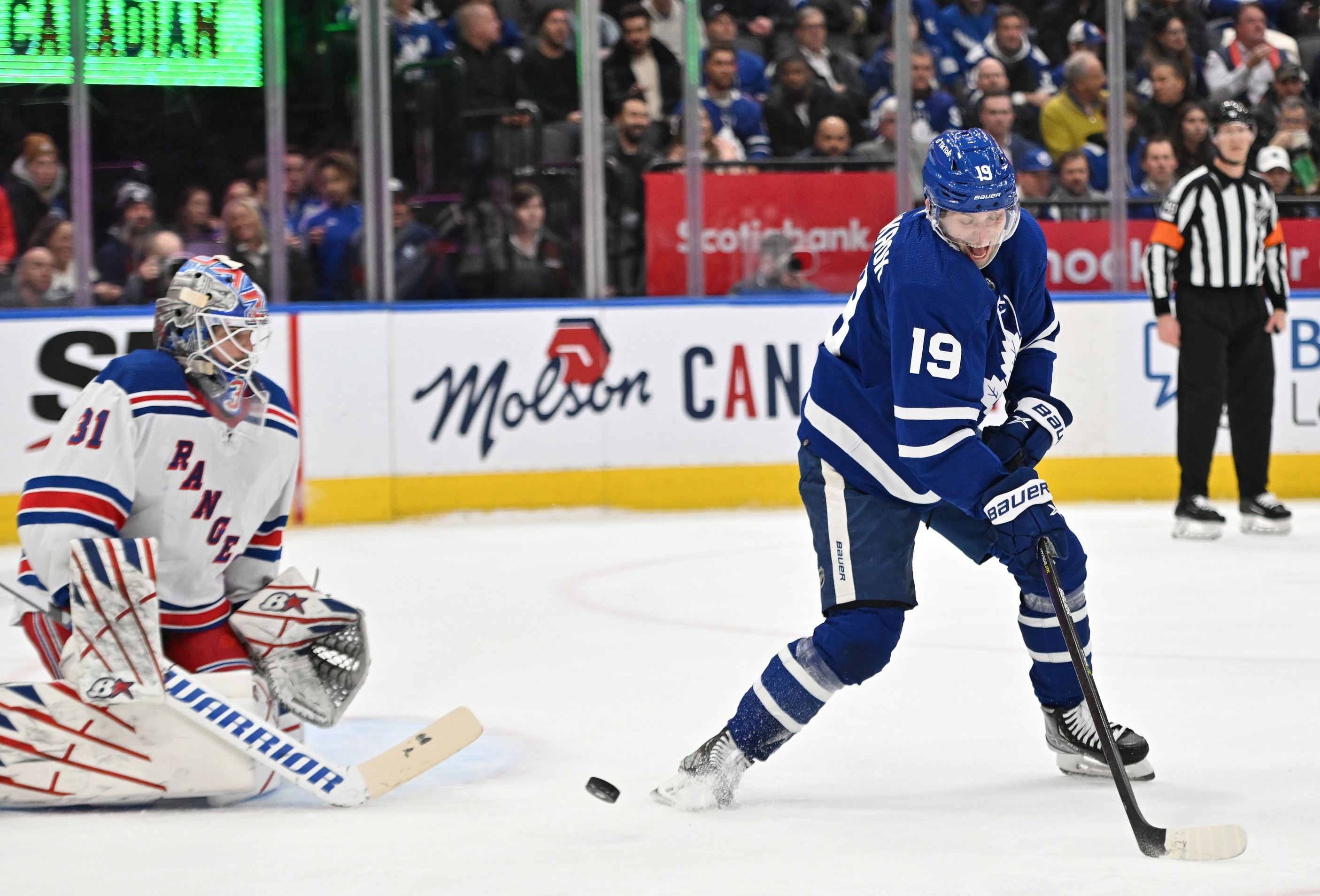 Toronto Maple Leafs forward Calle Jarnkrok (19) deflects the puck in front of New York Rangers goalie Igor Shesterkin (31) in the first period at Scotiabank Arena. / Dan Hamilton-USA TODAY Sports