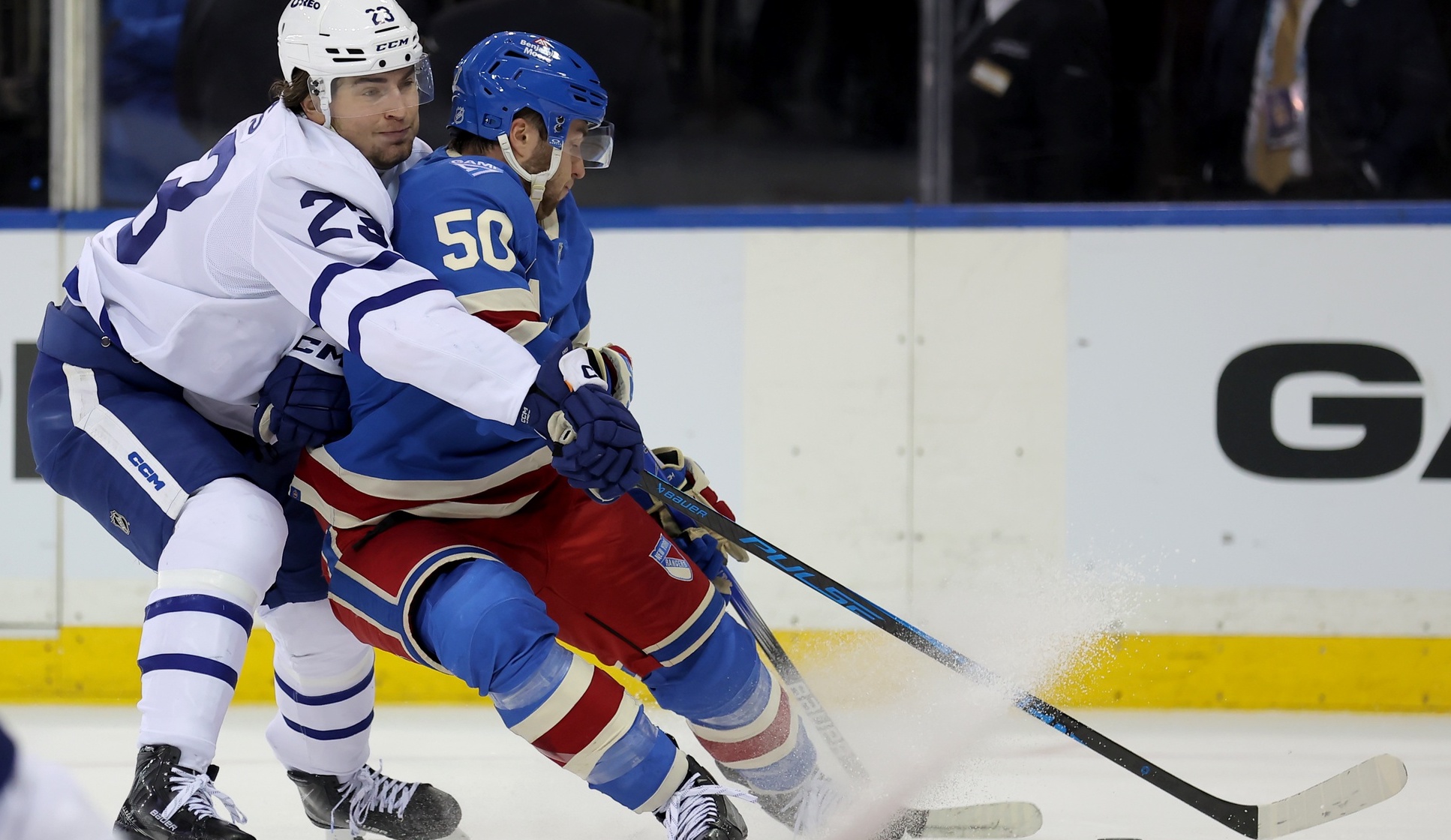 Rangers erupt in third period to beat Maple Leafs, 6-2New York gets first home win in regulation since November3/6/2026, 2:59 AMAssociated PressToronto Maple Leafs left wing Matthew Knies (23) and New York Rangers left wing Will Cuylle (50) fight for the puck during the second period at Madison Square Garden. / Brad Penner-Imagn Images