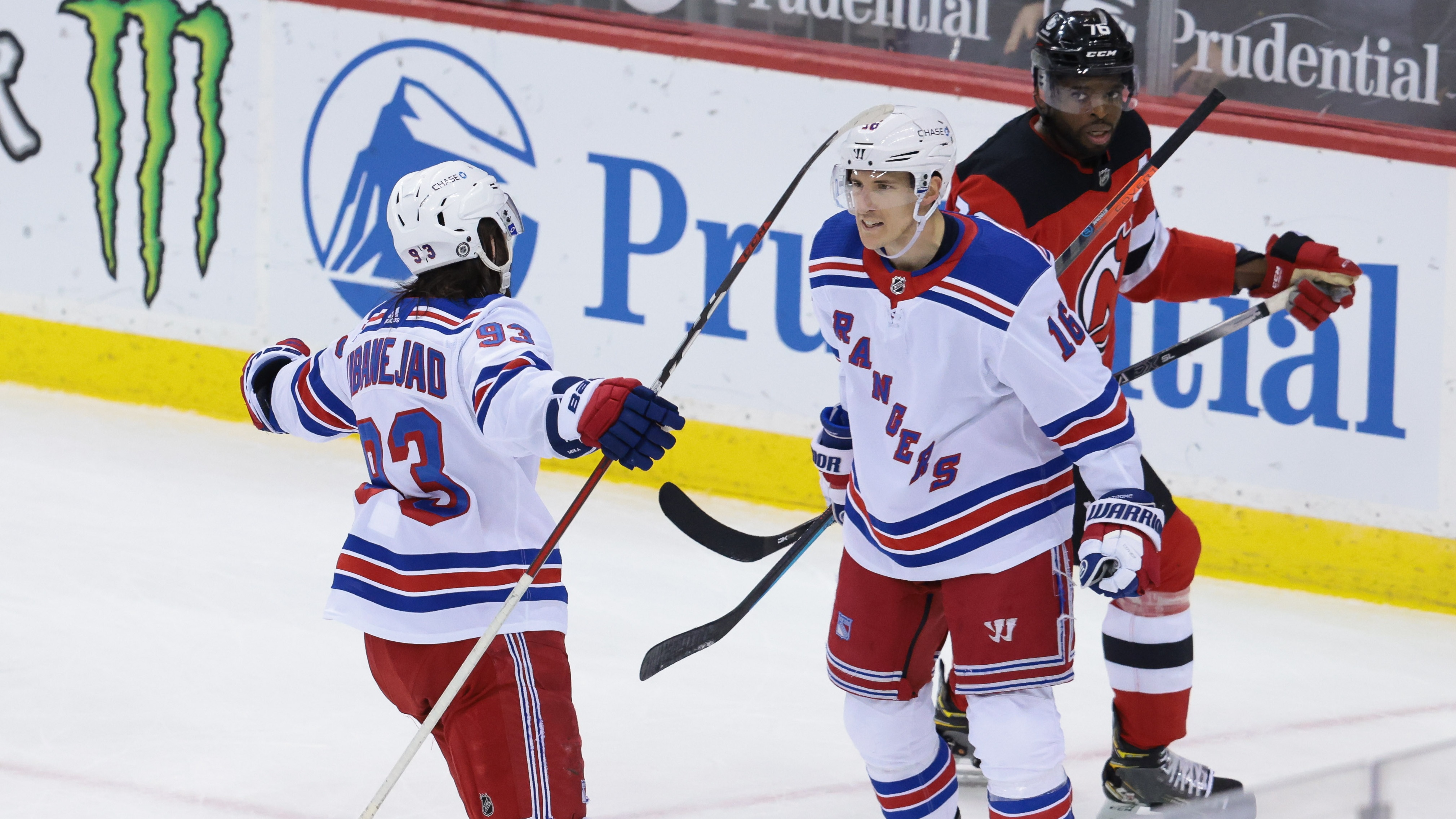 Mika Zibanejad scores goal on birthday as Rangers finish four-game sweep of DevilsRangers beat up on Devils, win 5-34/18/2021, 10:40 PMApr 18, 2021; Newark, New Jersey, USA; New York Rangers center Ryan Strome (16) celebrates his goal with center Mika Zibanejad (93) in front of New Jersey Devils defenseman P.K. Subban (76) during the third period at Prudential Center. / © Vincent Carchietta-USA TODAY Sports