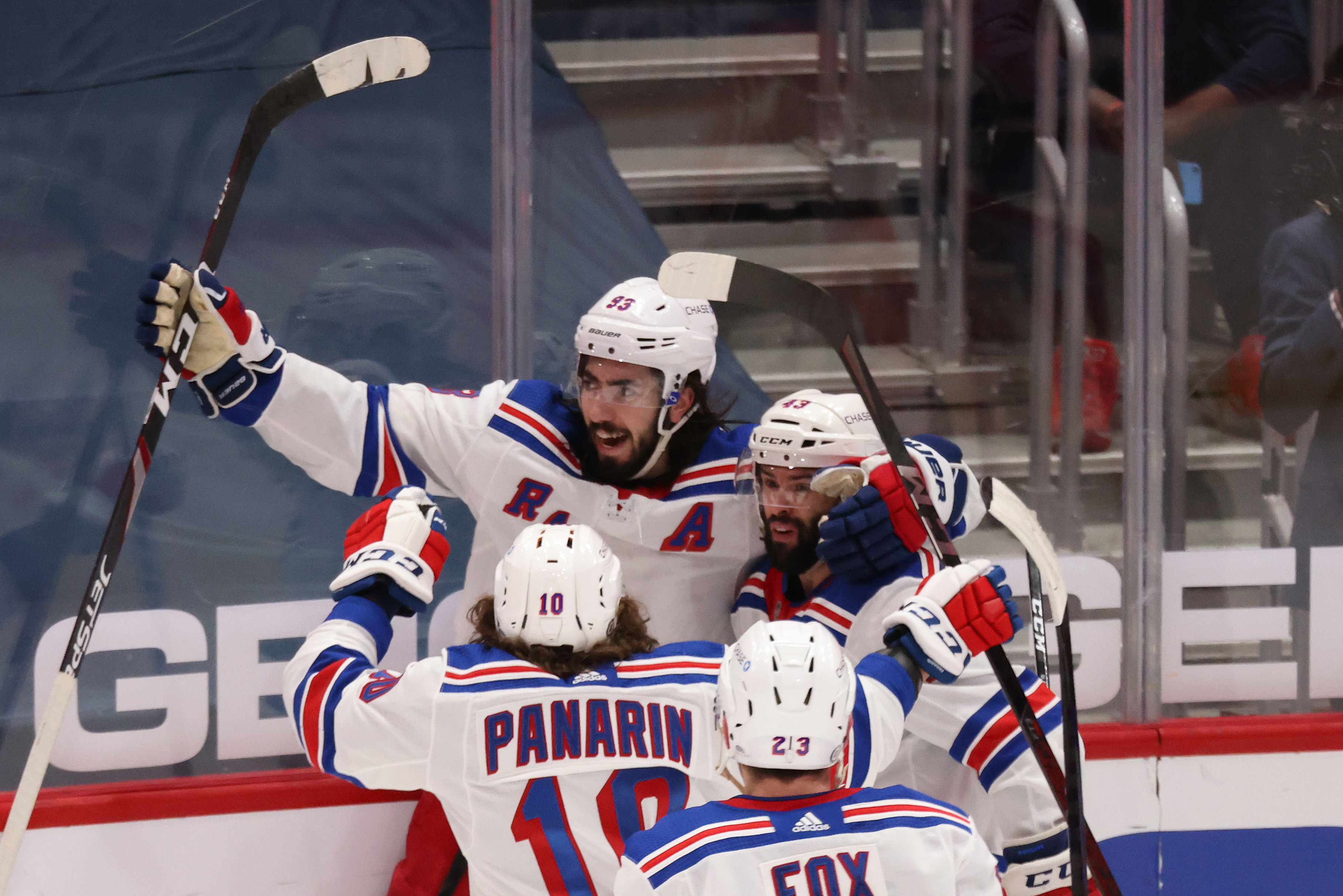 Mar 20, 2021; Washington, District of Columbia, USA; New York Rangers center Mika Zibanejad (93) celebrates with teammates after scoring the go ahead goal against the Washington Capitals late in the third period at Capital One Arena. Mandatory Credit: Geoff Burke-USA TODAY Sports / Geoff Burke-USA TODAY Sports
