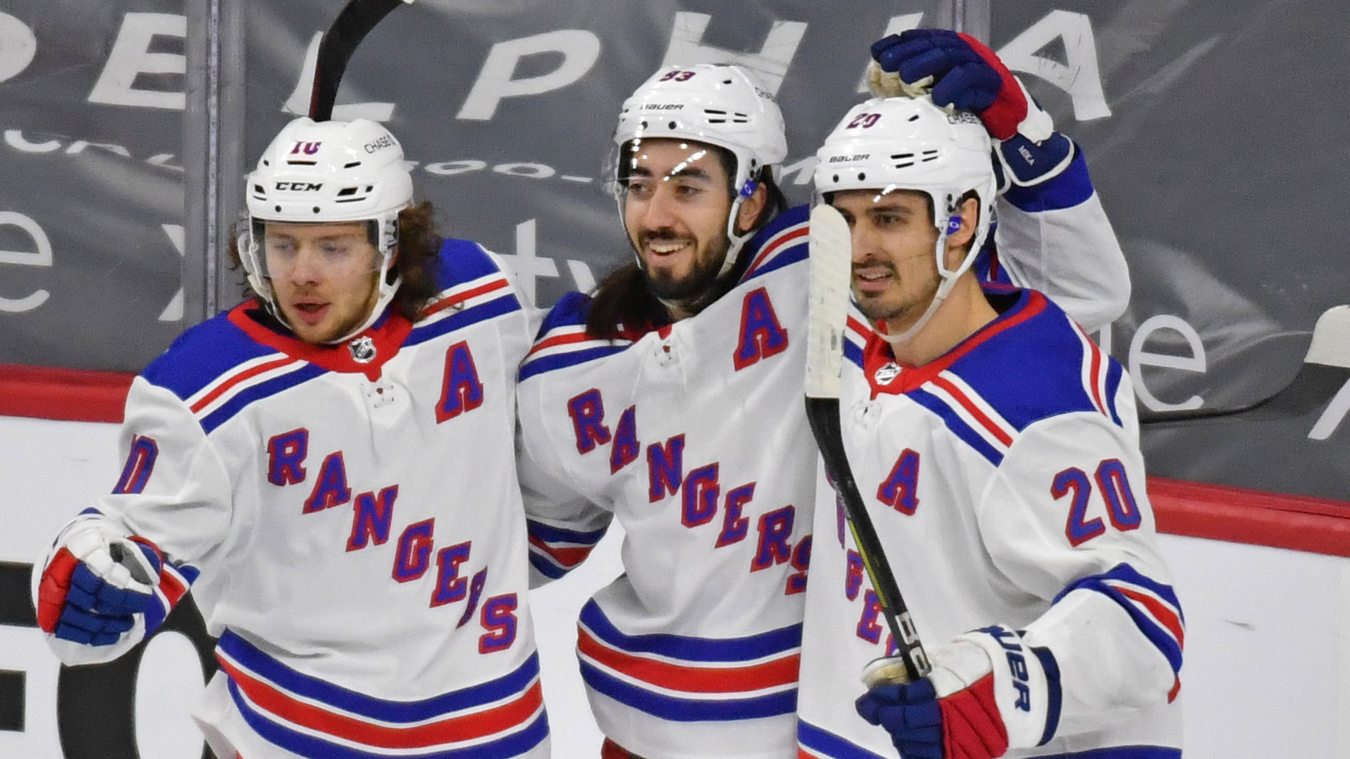 Mar 25, 2021; Philadelphia, Pennsylvania, USA; New York Rangers center Mika Zibanejad (93) celebrates his goal with left wing Artemi Panarin (10) and left wing Chris Kreider (20) against the Philadelphia Flyers during the first period at Wells Fargo Center. / Eric Hartline-USA TODAY Sports