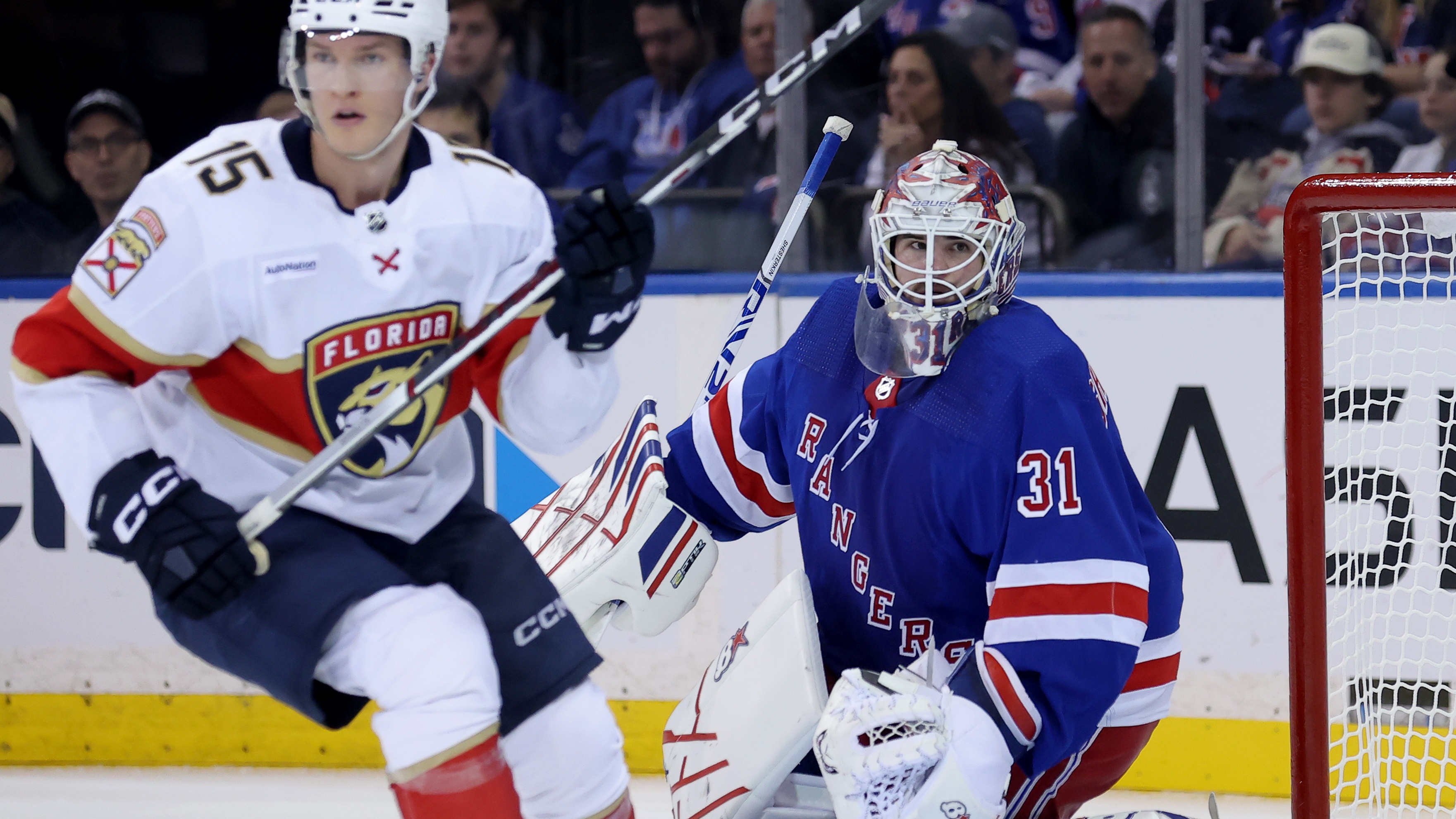 New York, New York, USA; New York Rangers goaltender Igor Shesterkin (31) and Florida Panthers center Anton Lundell (15) follow the puck during the second period of game one of the Eastern Conference Final of the 2024 Stanley Cup Playoffs at Madison Square Garden / Brad Penner - Imagn Images