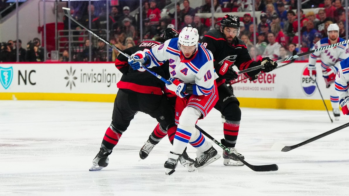 May 11, 2024; Raleigh, North Carolina, USA; Carolina Hurricanes right wing Andrei Svechnikov (37) shoots the puck against New York Rangers defenseman Ryan Lindgren (55) and goaltender Igor Shesterkin (31) during the second period in game four of the second round of the 2024 Stanley Cup Playoffs at PNC Arena. / James Guillory-USA TODAY Sports