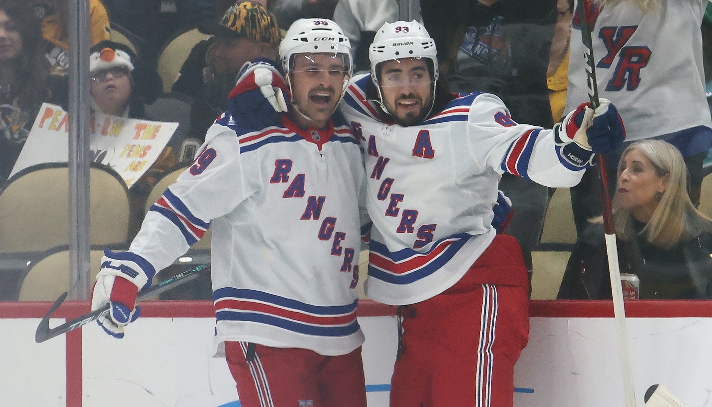 Rangers avenge season-opening loss with 6-1 rout over PenguinsAdam Fox scored twice, added assist10/12/2025, 2:20 AMAssociated PressNew York Rangers center Sam Carrick (39) and center Mika Zibanejad (93) celebrate a goal by Zibanejad against the Penguins during the first period at PPG Paints Arena. / Charles LeClaire-Imagn Images