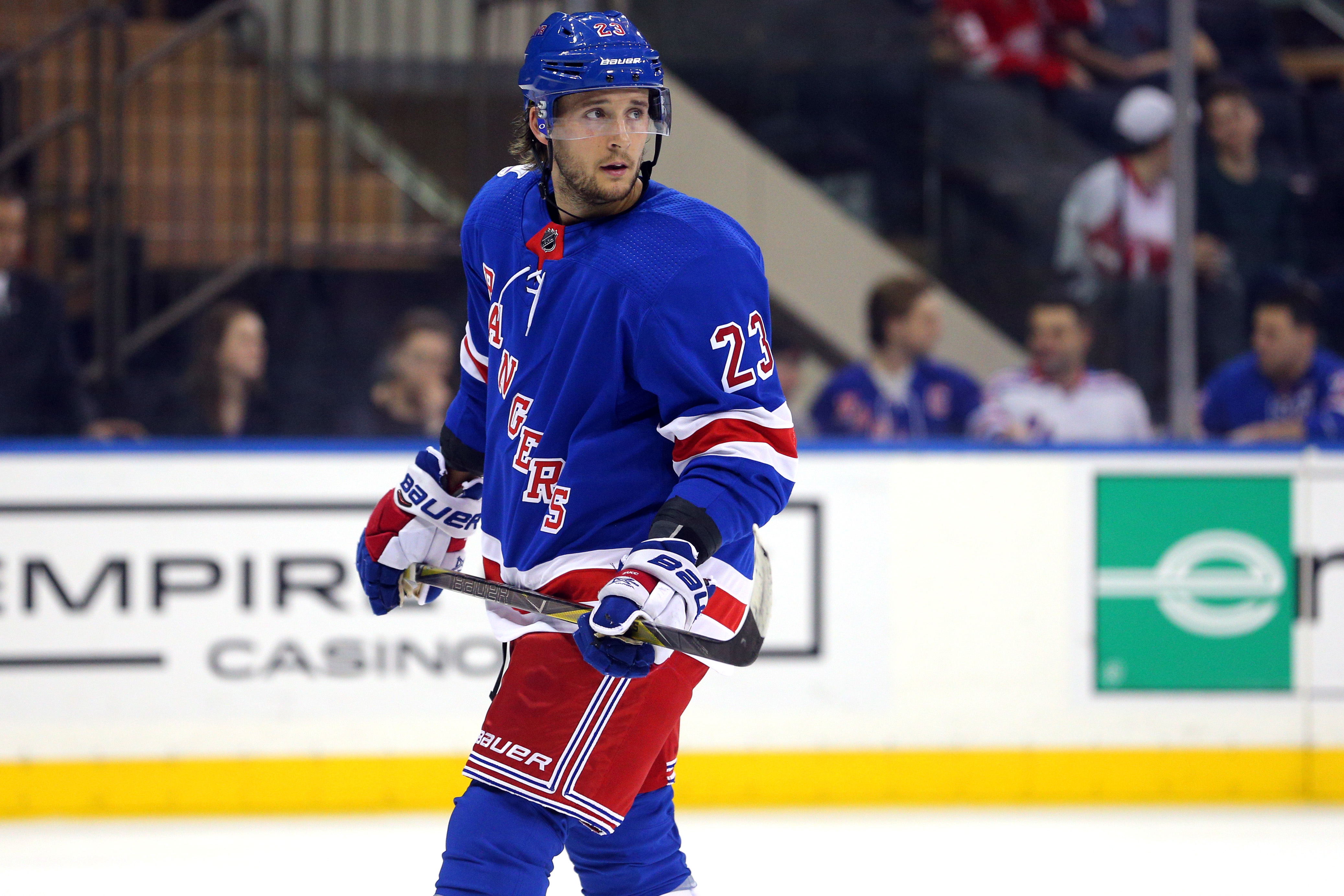 Feb 25, 2018; New York, NY, USA; New York Rangers center Ryan Spooner (23) during the third period against the Detroit Red Wings at Madison Square Garden. This was Spooner's first game with the Rangers after being acquired from the Boston Bruins. Mandatory Credit: Brad Penner-USA TODAY Sports / Brad Penner