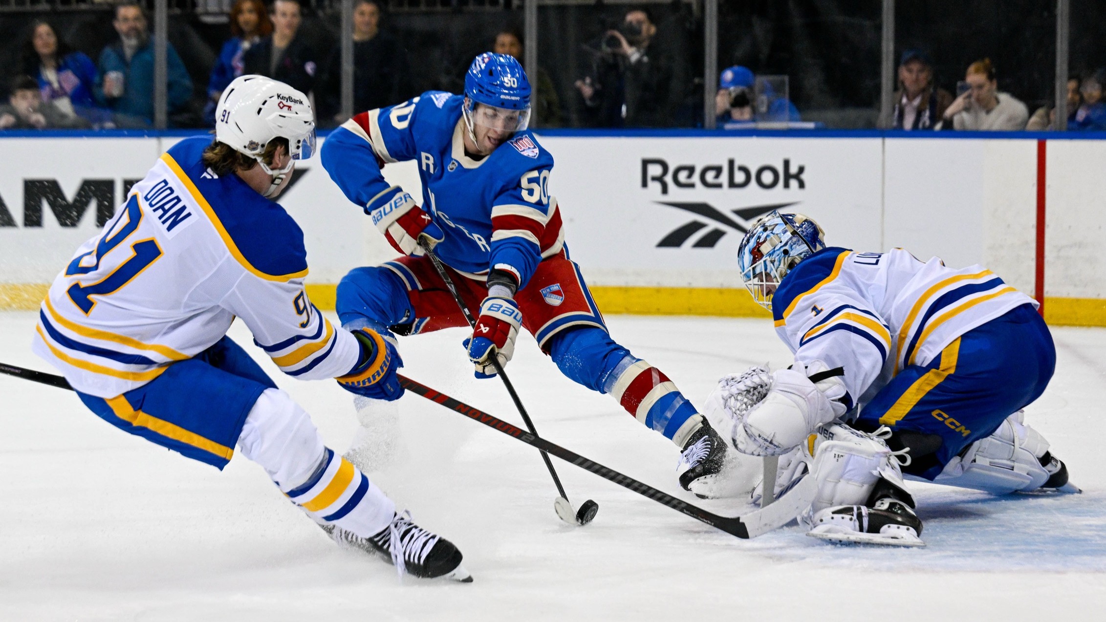 Apr 8, 2026; New York, New York, USA; New York Rangers left wing Will Cuylle (50) attempts a shot on Buffalo Sabres goaltender Ukko-Pekka Luukkonen (1) defended by Buffalo Sabres right wing Josh Doan (91) during the second period at Madison Square Garden. / Dennis Schneidler-Imagn Images