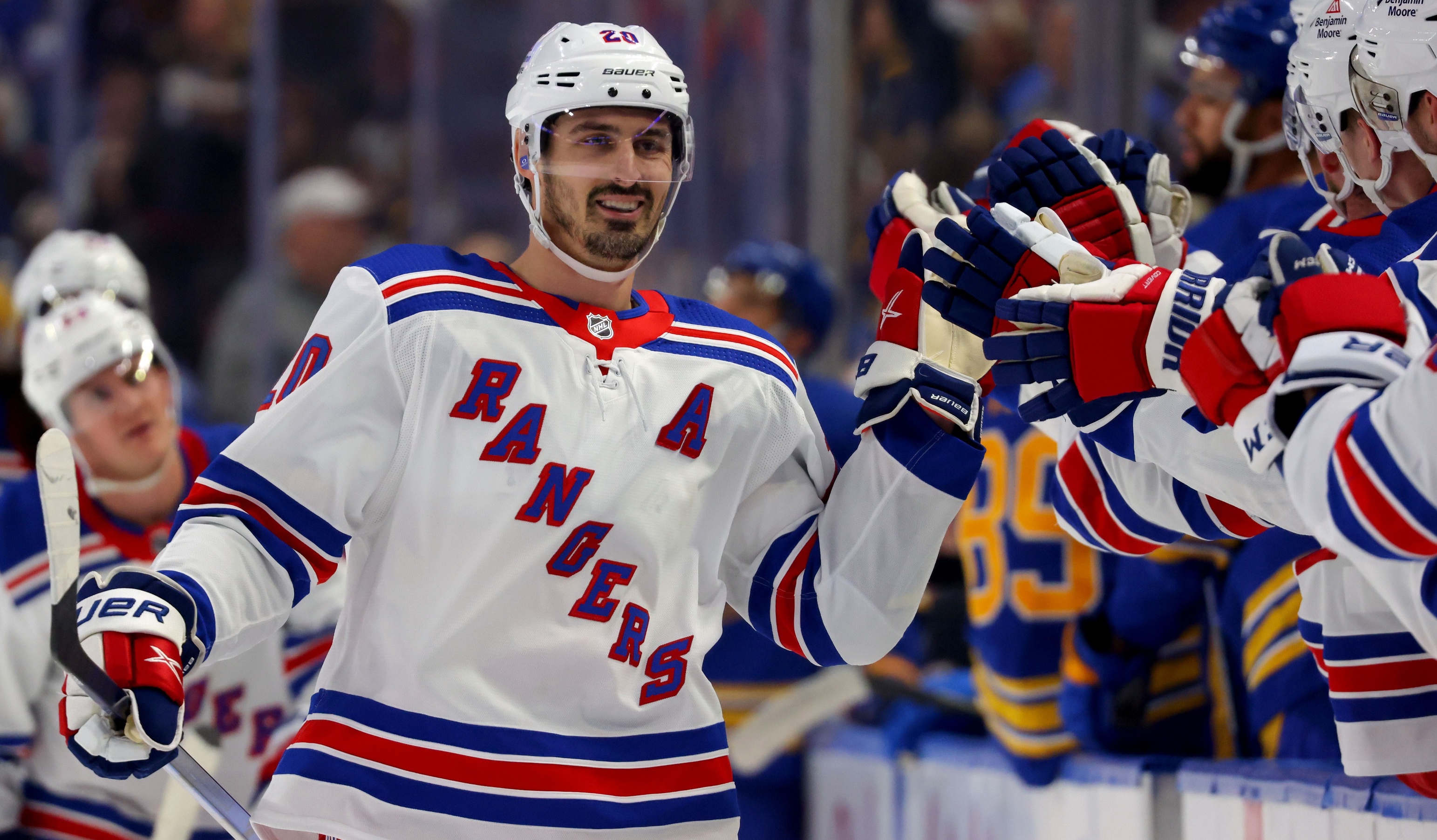 New York Rangers left wing Chris Kreider (20) celebrates his goal with teammates during the first period against the Buffalo Sabres at KeyBank Center. / Timothy T. Ludwig-USA TODAY Sports