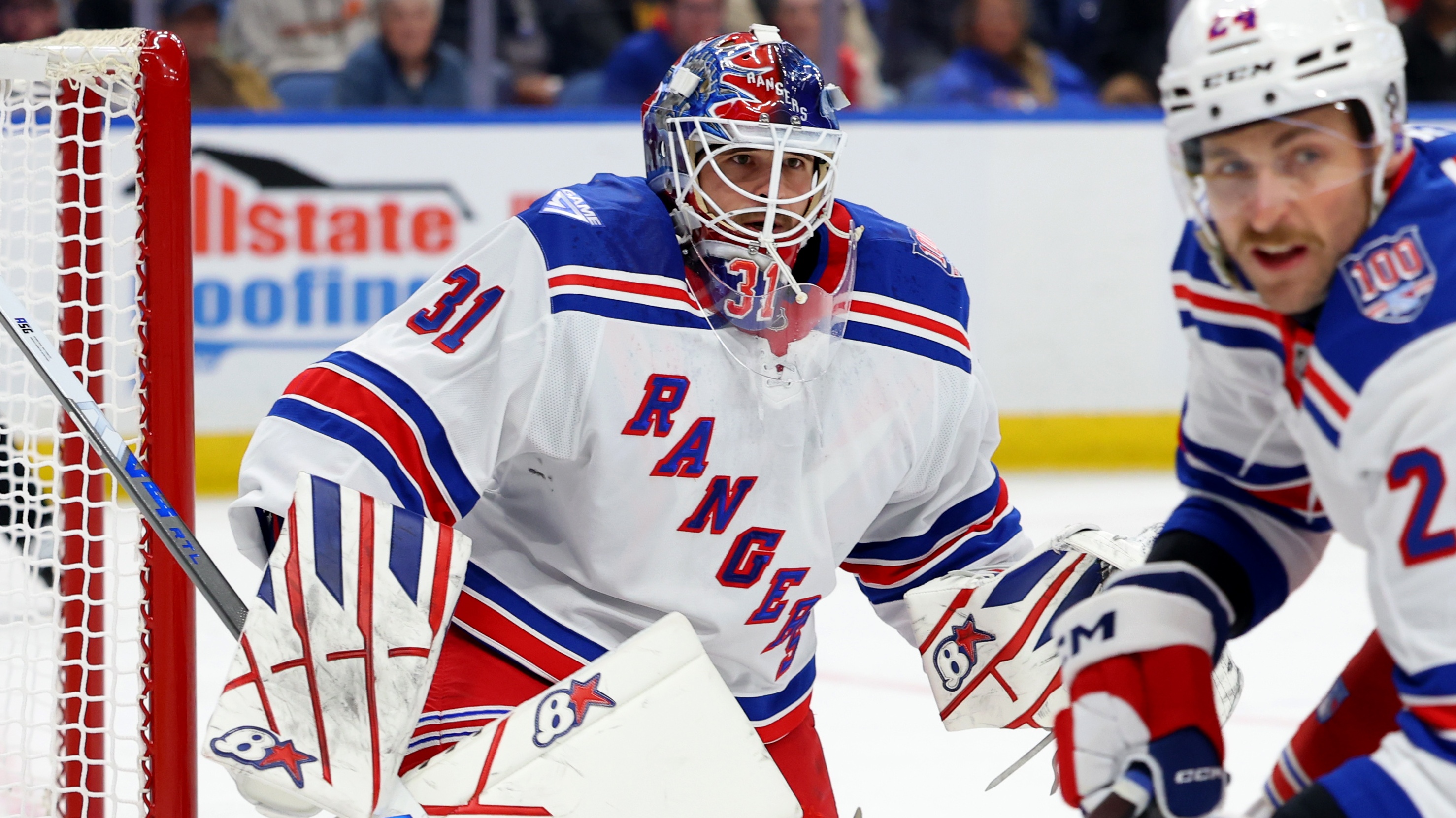 Igor Shesterkin makes 36 saves, Rangers score three late goals in 4-0 win over SabresJ.T. Miller and Alexis Lafreniere finished with two points each10/10/2025, 1:45 AMJohn FlaniganFreelance Editorial ProducerNew York Rangers goaltender Igor Shesterkin (31) looks for the puck during the first period against the Buffalo Sabres at KeyBank Center / Timothy T. Ludwig - Imagn Images