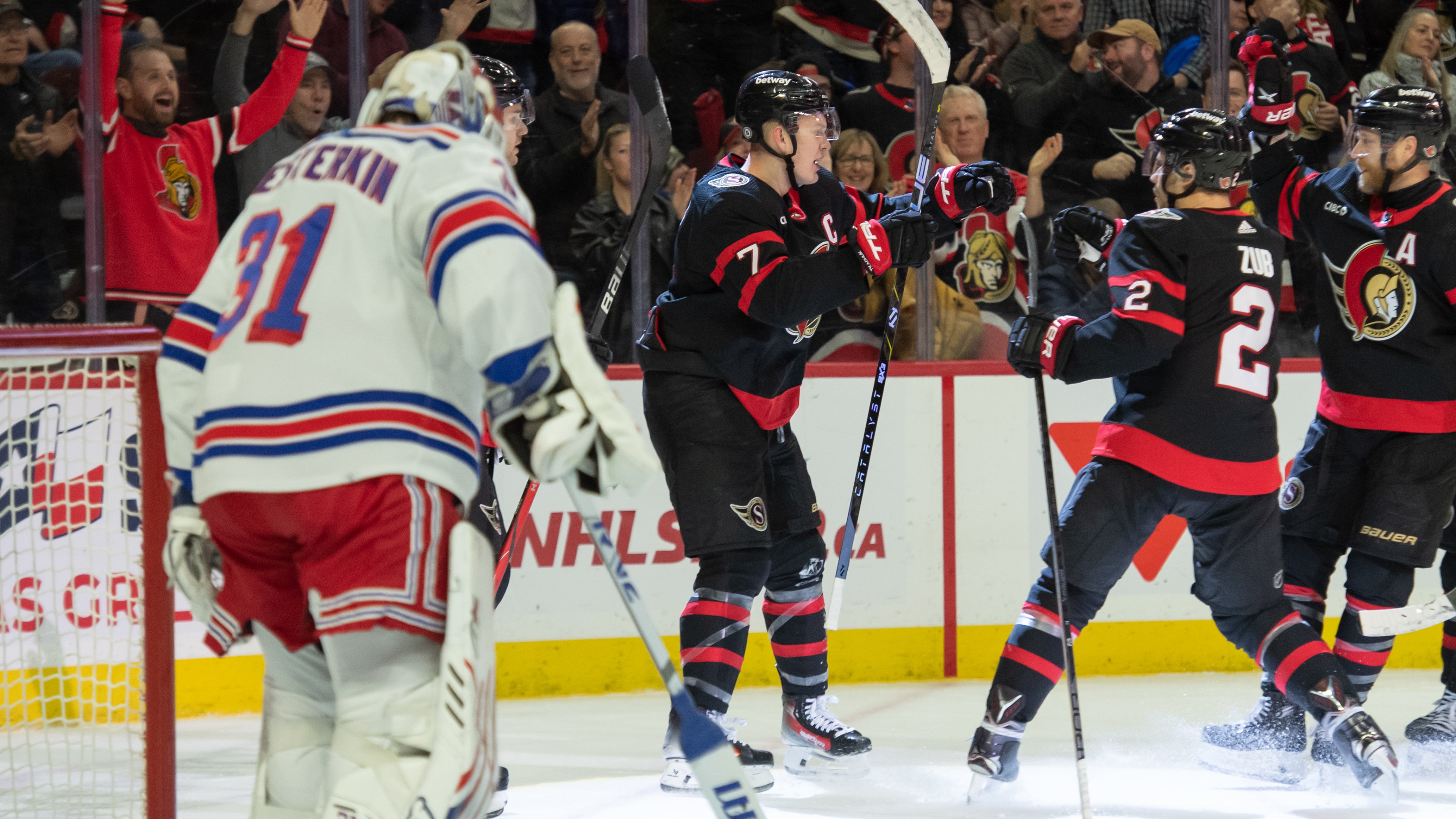 Rangers' three-game winning streak comes to an end with 6-2 loss to SenatorsNew York's allowed 11 goals over the last two games12/6/2023, 3:12 AMSNY NewsdeskOttawa Senators left wing Brady Tkachuk (7) celebrates with team his goal scored against New York Rangers goalie Igor Shesterkin (31) in the first period at the Canadian Tire Centre / Mark DesRosiers - USA TODAY Sports