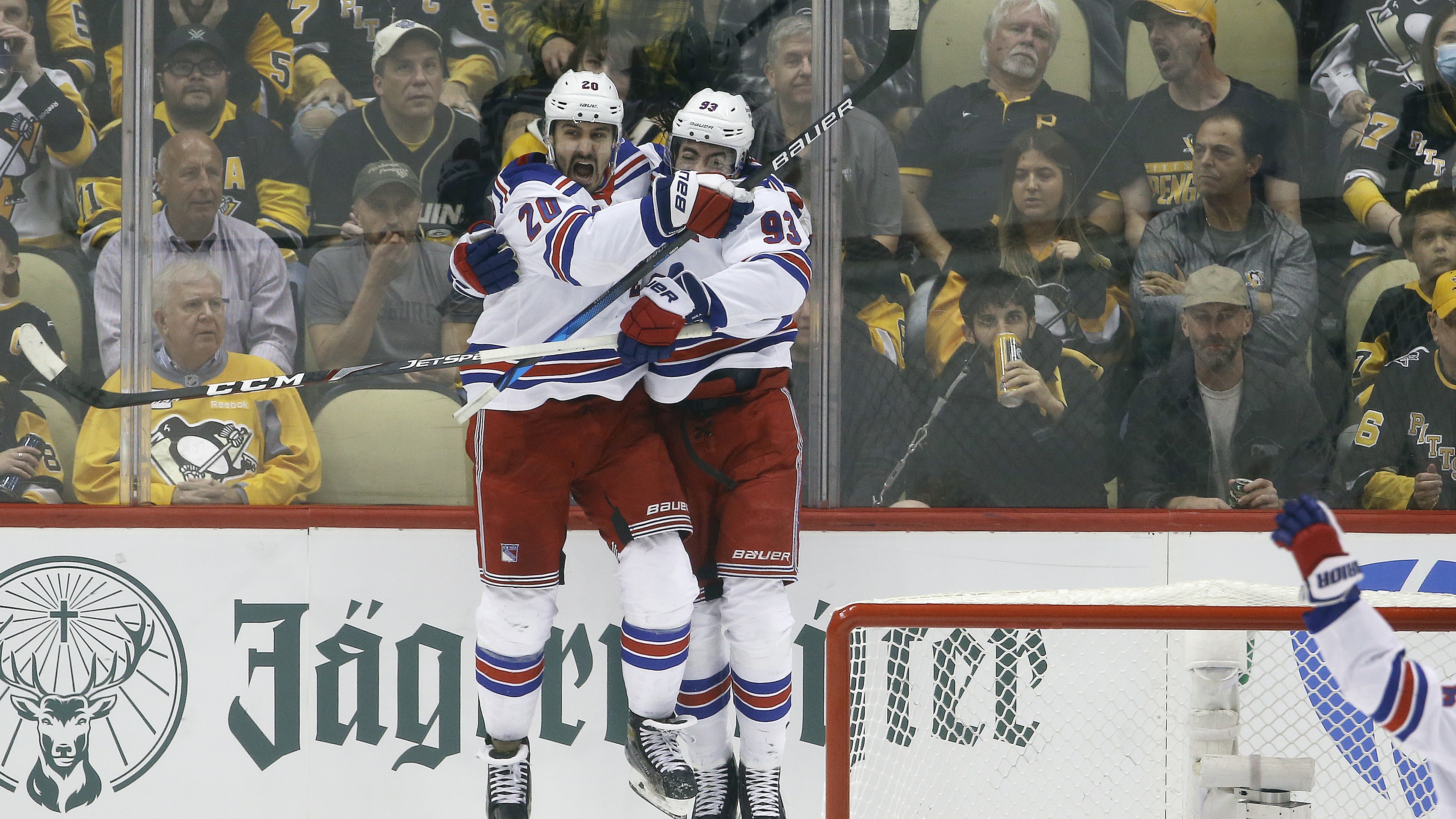 May 13, 2022; Pittsburgh, Pennsylvania, USA; New York Rangers left wing Chris Kreider (20) and center Mika Zibanejad (93) celebrate a goal by Kreider against Pittsburgh Penguins goaltender Louis Domingue (70) during the second period in game six of the first round of the 2022 Stanley Cup Playoffs at PPG Paints Arena. Mandatory Credit: Charles LeClaire-USA TODAY Sports / Charles LeClaire-USA TODAY Sports