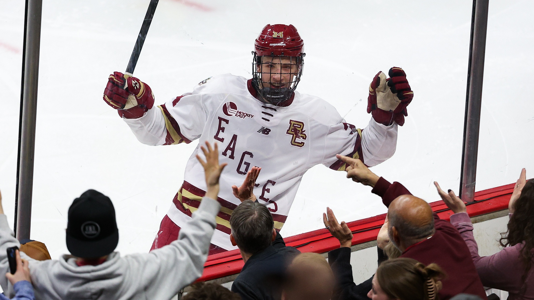 Boston College Eagles forward Gabe Perreault (34) celebrates his goal against the Michigan Wolverines during the third period in the semifinals of the 2024 Frozen Four college ice hockey tournament at Xcel Energy Center / Matt Krohn - USA TODAY Sports