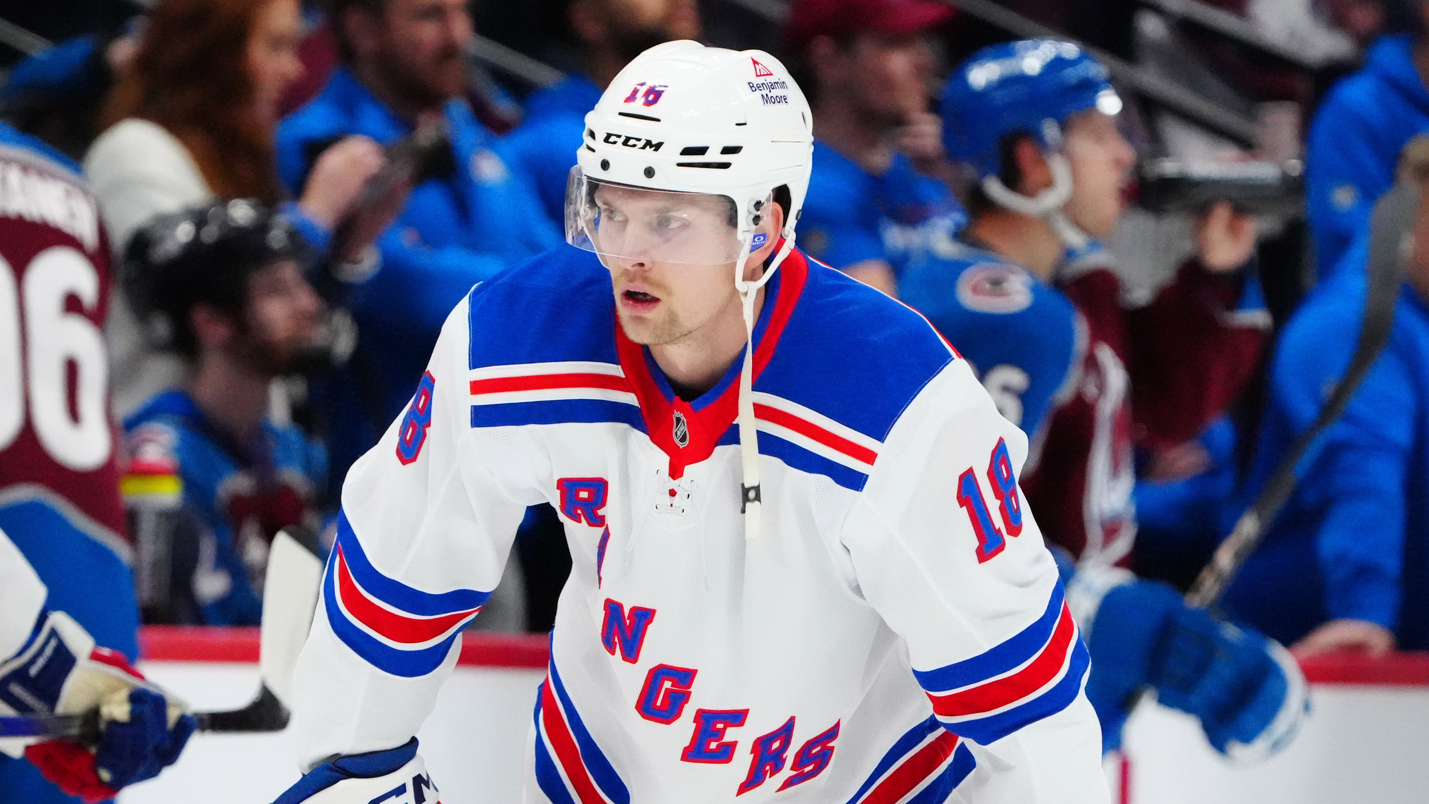 Jan 14, 2025; Denver, Colorado, USA; New York Rangers defenseman Urho Vaakanainen (18) before the game against the against the Colorado Avalanche at Ball Arena. / Ron Chenoy - Imagn Images