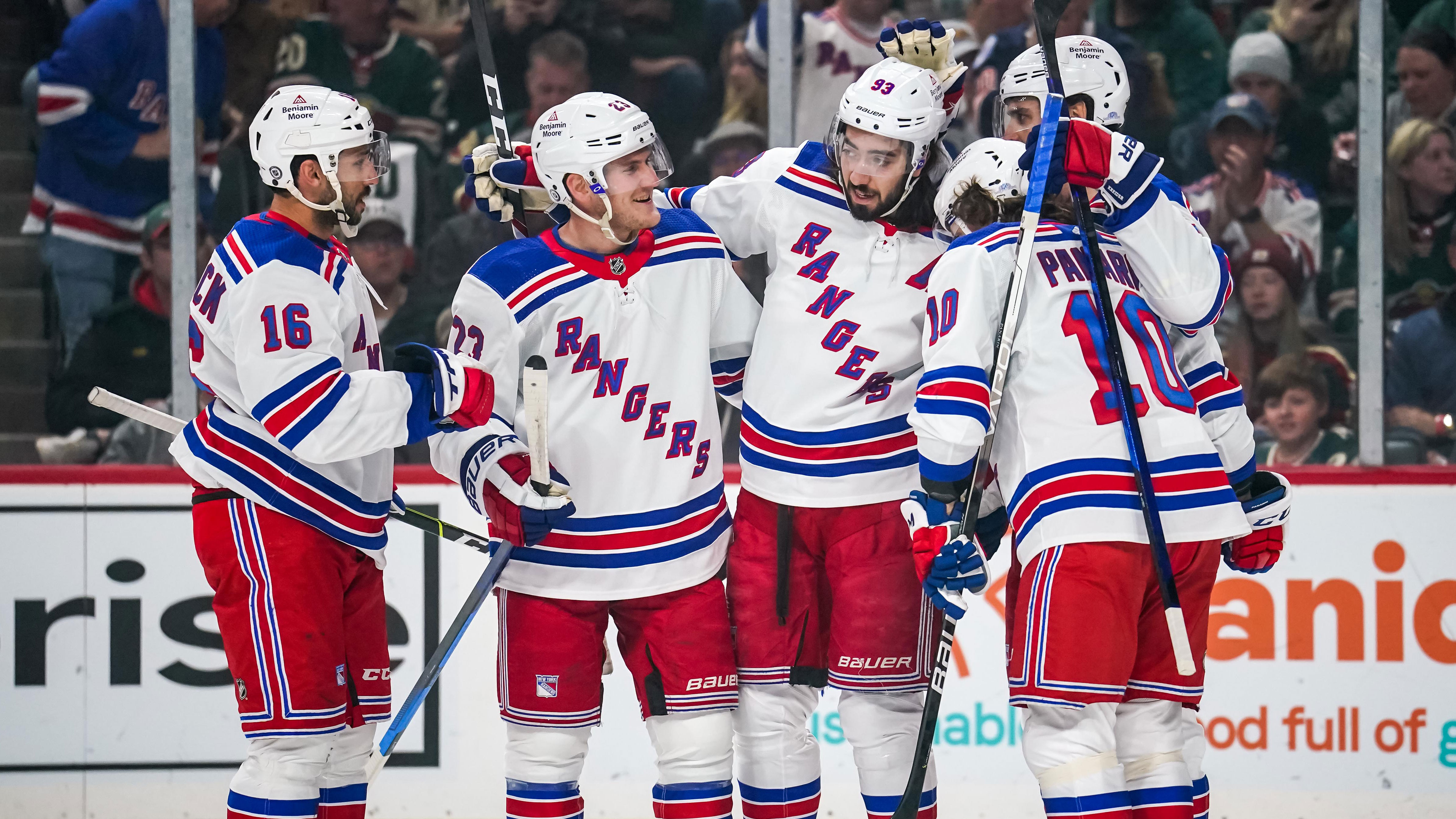 Oct 13, 2022; Saint Paul, Minnesota, USA; New York Rangers left wing Chris Kreider (20) celebrates his goal with teammates during the first period against the Minnesota Wild at Xcel Energy Center. / Brace Hemmelgarn-USA TODAY Sports