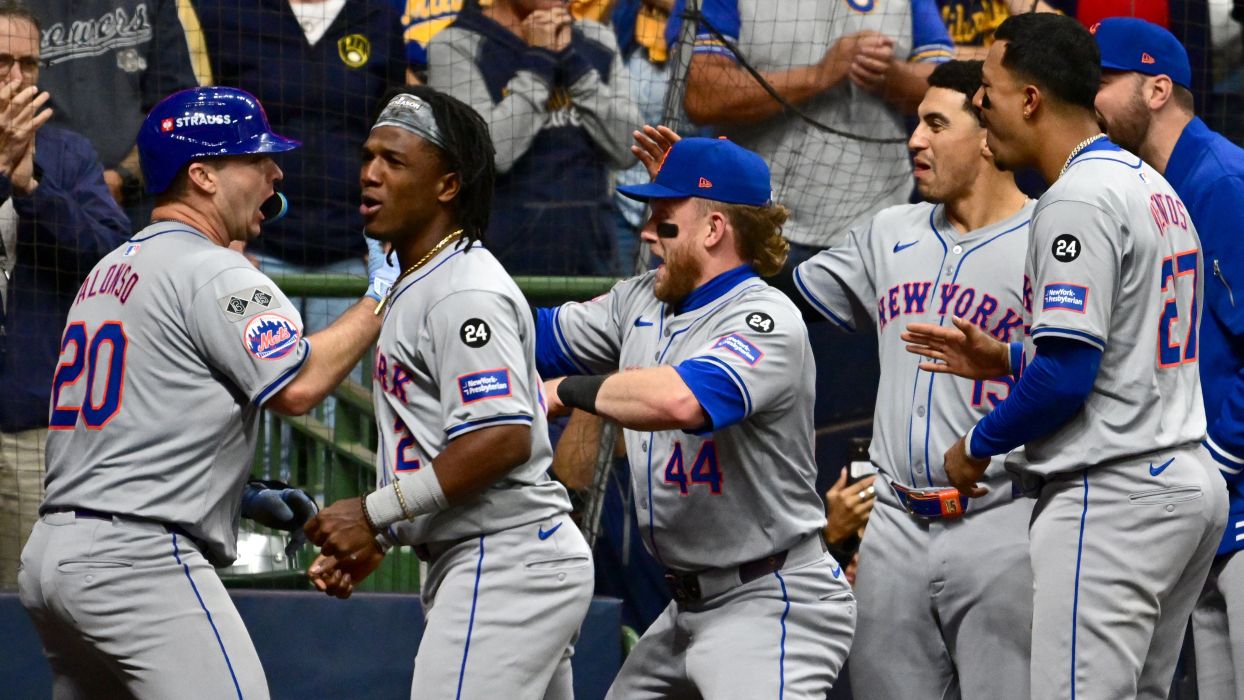 Sep 3, 2020; New York City, New York, USA; New York Mets first baseman Pete Alonso (20) is greeted by teammates to celebrate the victory after hitting a 2 run home run during the tenth inning against the New York Yankees at Citi Field. / Gregory Fisher-Imagn Images