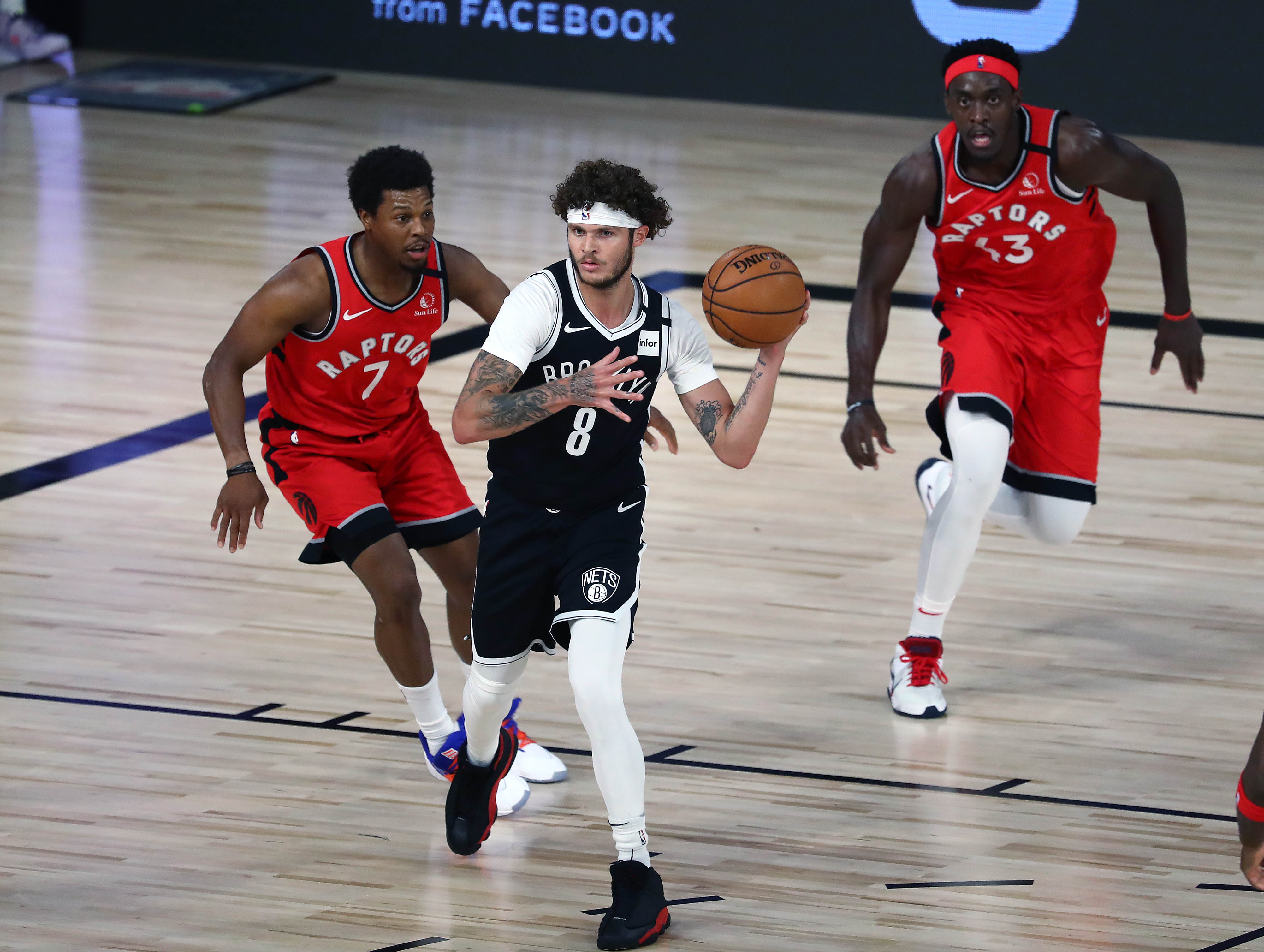 Aug 23, 2020; Lake Buena Vista, Florida, USA; Brooklyn Nets guard Tyler Johnson (8) controls the ball against Toronto Raptors guard Kyle Lowry (7) and forward Pascal Siakam (43) during the first half in game four of the first round of the 2020 NBA Playoffs at The Field House. / Kim Klement-USA TODAY Sports