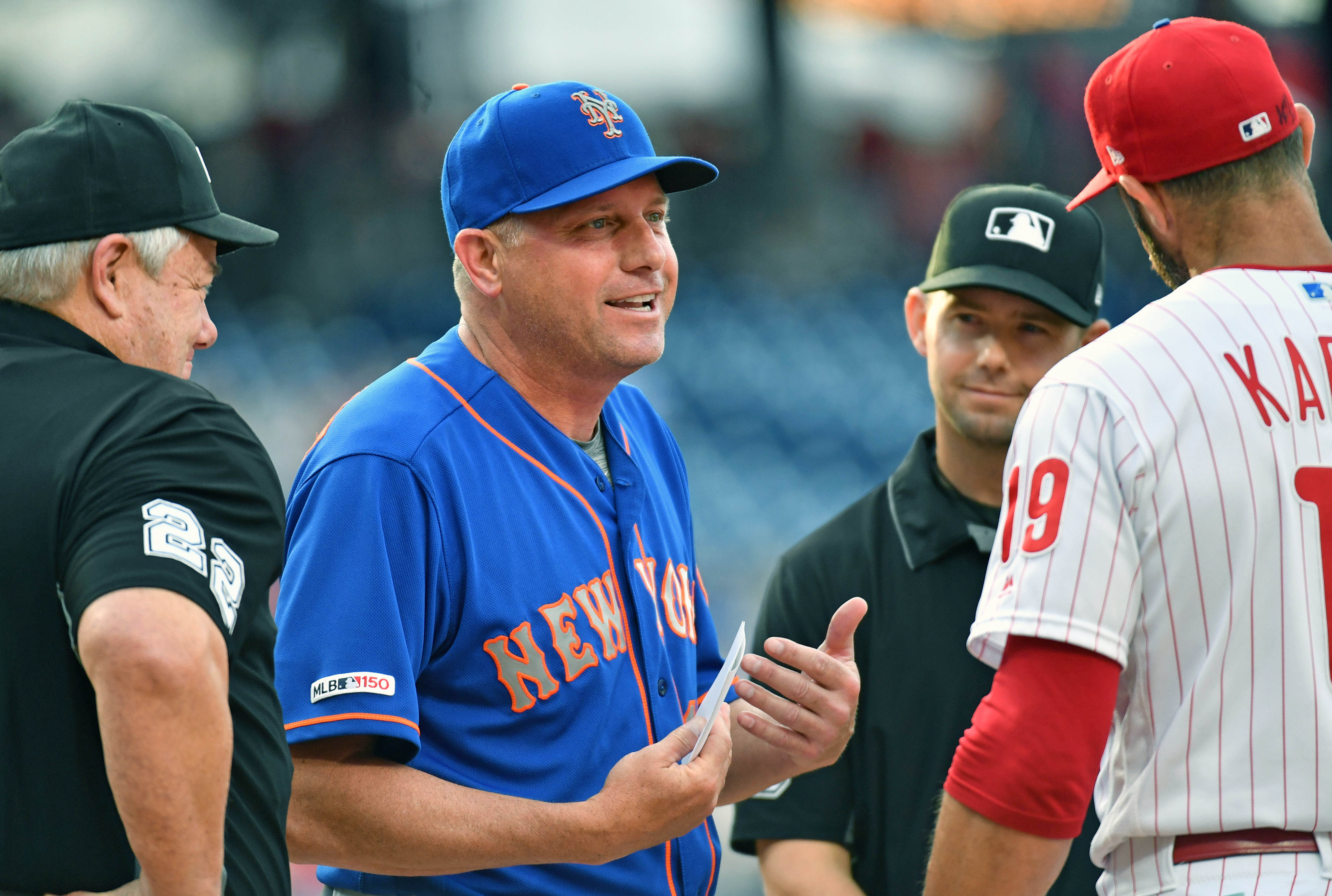 Jun 25, 2019; Philadelphia, PA, USA; New York Mets third base coach Gary Disarcina (10) exchanges lineups with Philadelphia Phillies manager Gabe Kapler (19) at Citizens Bank Park. Mandatory Credit: Eric Hartline-USA TODAY Sports / Eric Hartline