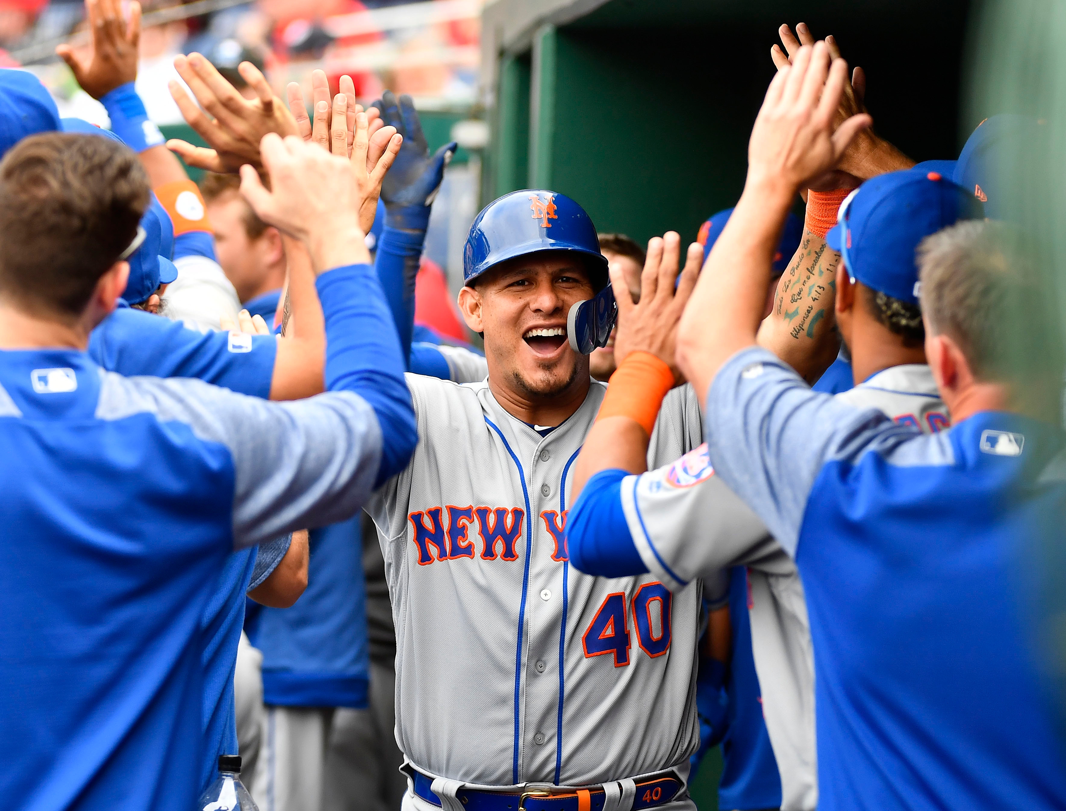 Mar 30, 2019; Washington, DC, USA; New York Mets catcher Wilson Ramos (40) reacts after scoring a run against the Washington Nationals during the eighth inning at Nationals Park. Mandatory Credit: Brad Mills-USA TODAY Sports / Brad Mills