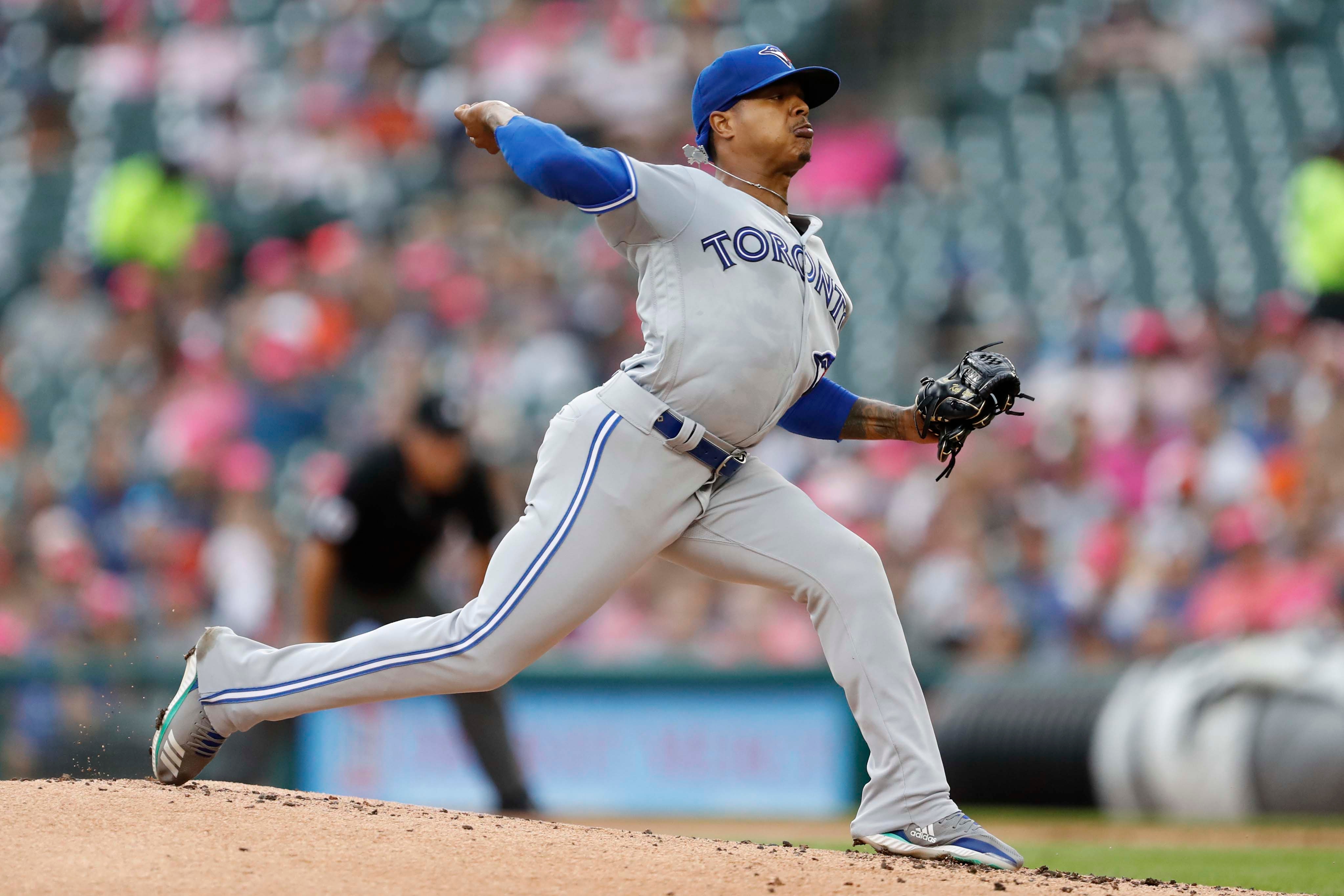 Jul 19, 2019; Detroit, MI, USA; Toronto Blue Jays starting pitcher Marcus Stroman (6) pitches during the first inning against the Detroit Tigers at Comerica Park. Mandatory Credit: Raj Mehta-USA TODAY Sports / Raj Mehta