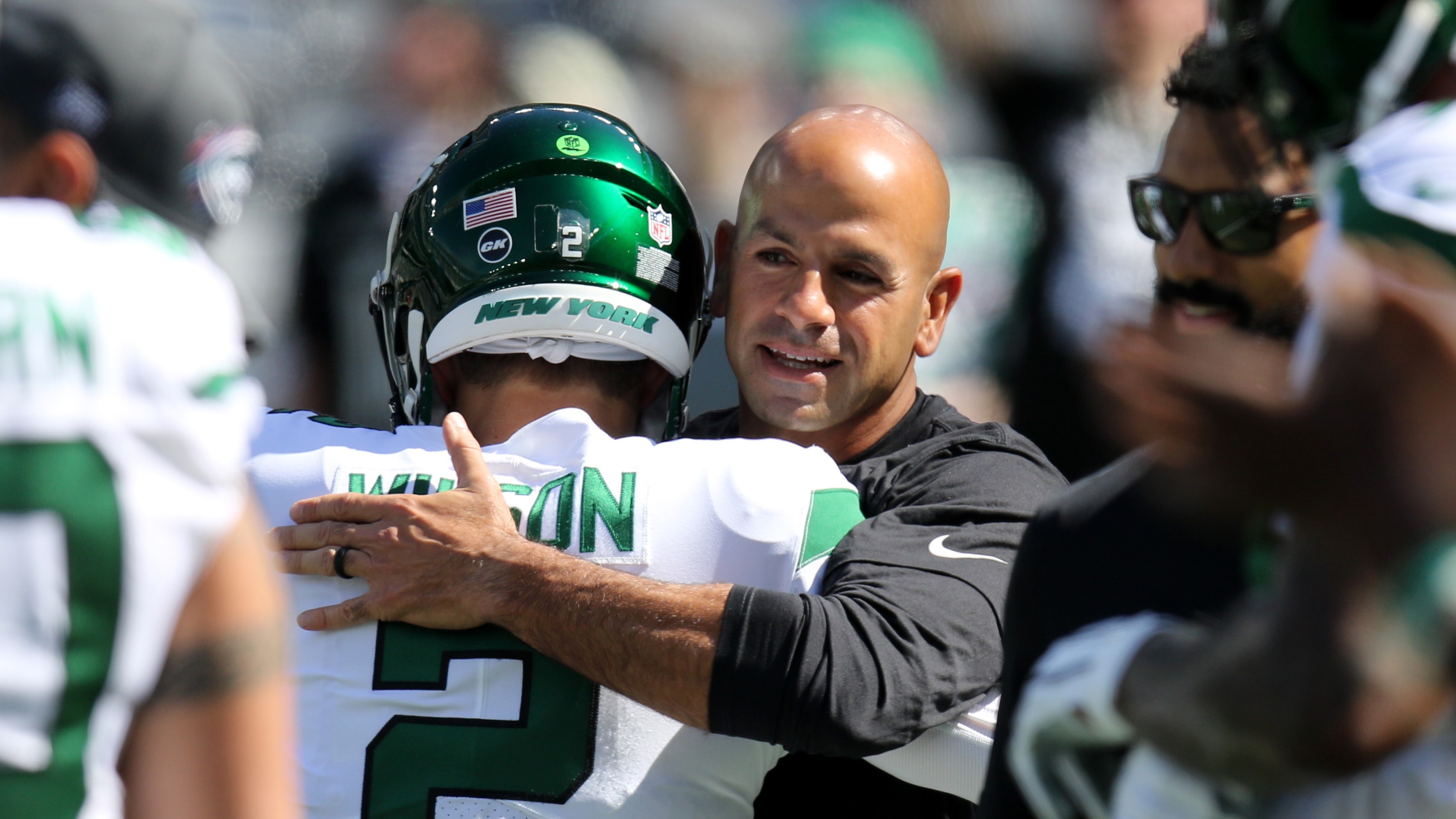 Oct 3, 2021; East Rutherford, NJ, USA; New York Jets head coach Robert Saleh hugs quarterback Zach Wilson before the game against the Tennessee Titans at MetLife Stadium. Mandatory Credit: Kevin R. Wexler-USA TODAY Sports / Kevin R. Wexler-USA TODAY Sports