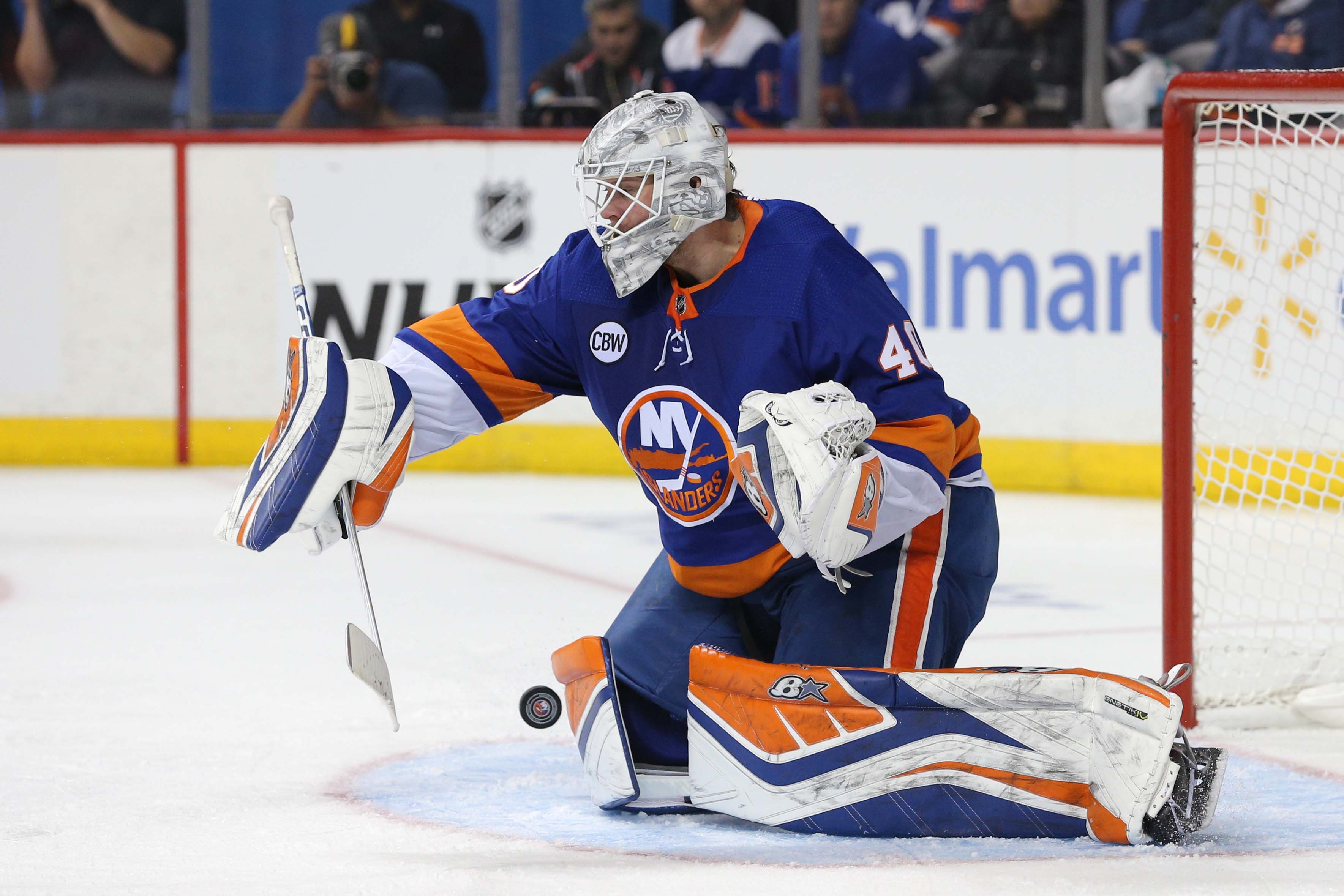 Apr 28, 2019; Brooklyn, NY, USA; New York Islanders goalie Robin Lehner (40) makes a save against the Carolina Hurricanes during the third period of game two of the second round of the 2019 Stanley Cup Playoffs at Barclays Center. Mandatory Credit: Brad Penner-USA TODAY Sports / Brad Penner