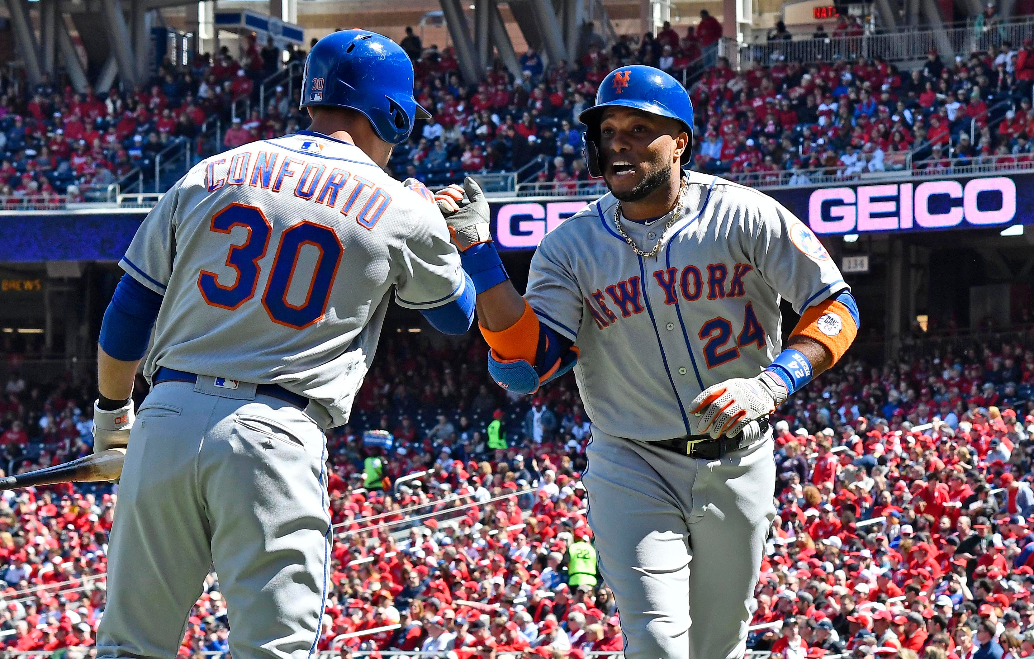 Mar 28, 2019; Washington, DC, USA; New York Mets second baseman Robinson Cano (24) is congratulated by left fielder Michael Conforto (30) after hitting a solo home run against the Washington Nationals during the first inning at Nationals Park. Mandatory Credit: Brad Mills-USA TODAY Sports / Brad Mills