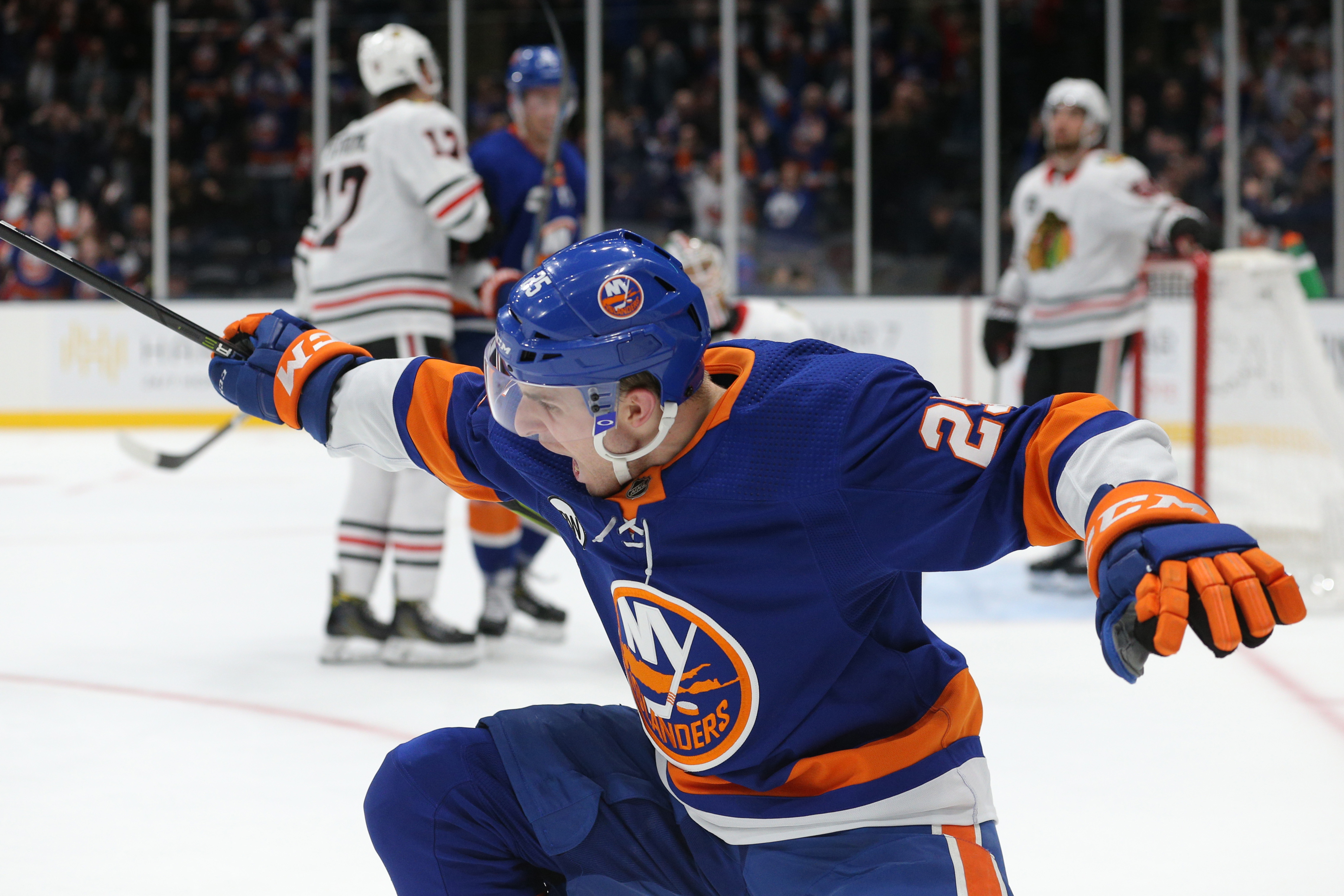 Jan 3, 2019; Uniondale, NY, USA; New York Islanders defenseman Devon Toews (25) celebrates his game winning goal against the Chicago Blackhawks during overtime at Nassau Veterans Memorial Coliseum. Mandatory Credit: Brad Penner-USA TODAY Sports / Brad Penner