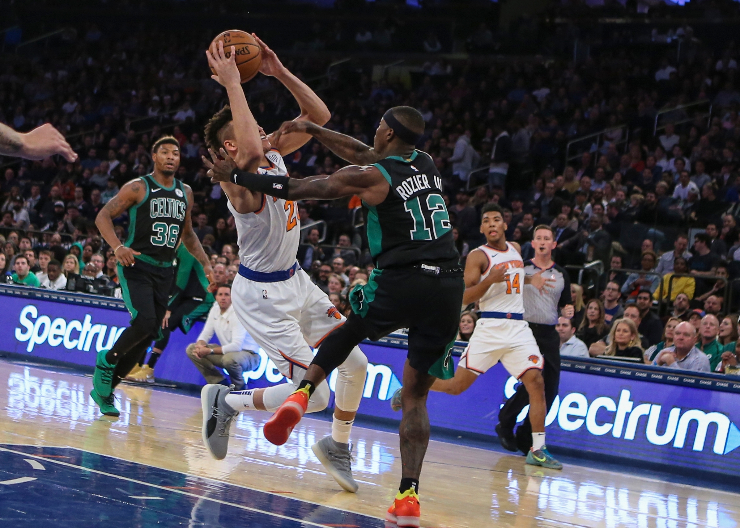 New York Knicks forward Kevin Knox collides with Boston Celtics guard Terry Rozier III in the first quarter at Madison Square Garden. / Wendell Cruz/USA TODAY Sports