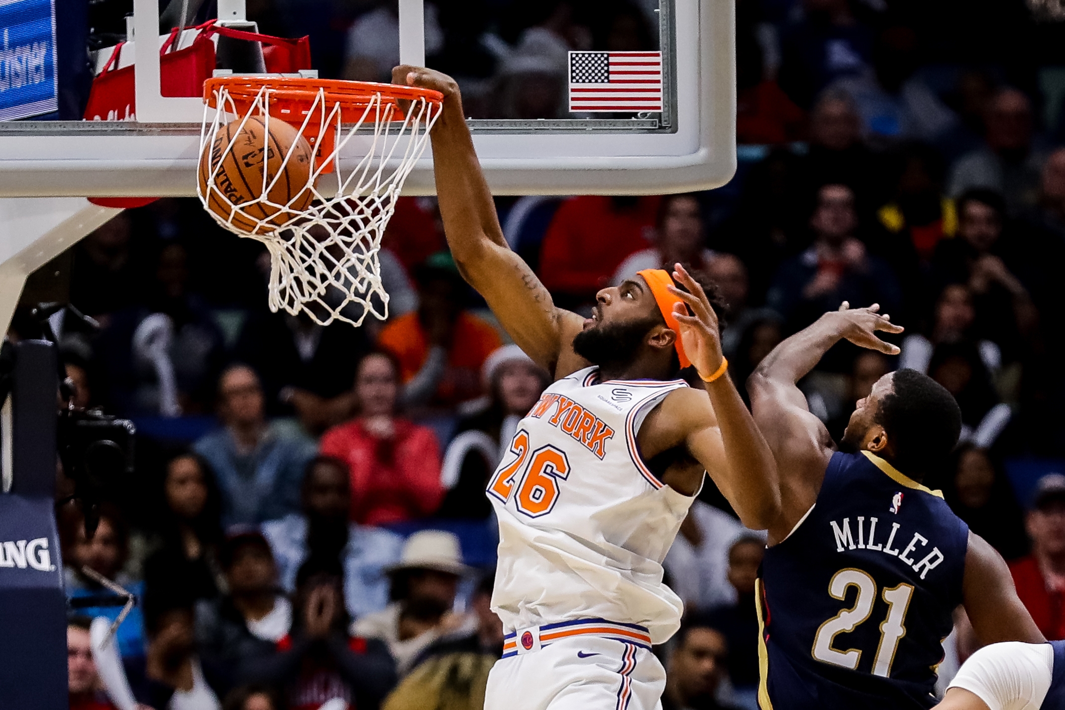 Nov 16, 2018; New Orleans, LA, USA; New York Knicks center Mitchell Robinson (26) dunks the ball against New Orleans Pelicans forward Darius Miller (21) in the second half at Smoothie King Center. Mandatory Credit: Stephen Lew-USA TODAY Sports / Stephen Lew