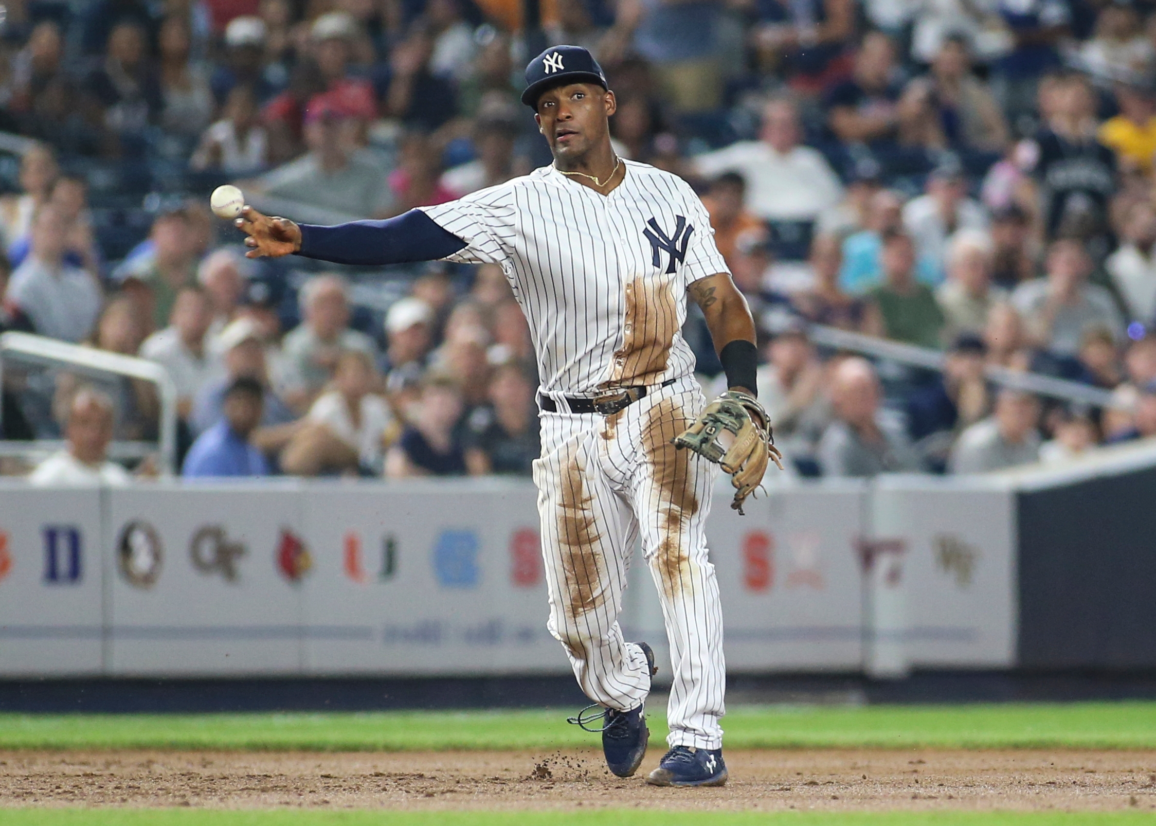 Aug 28, 2018; Bronx, NY, USA; New York Yankees third baseman Miguel Andujar (41) throws a runner out at first base to end the top of the fifth inning against the Chicago White Sox at Yankee Stadium. Mandatory Credit: Wendell Cruz-USA TODAY Sports / Wendell Cruz
