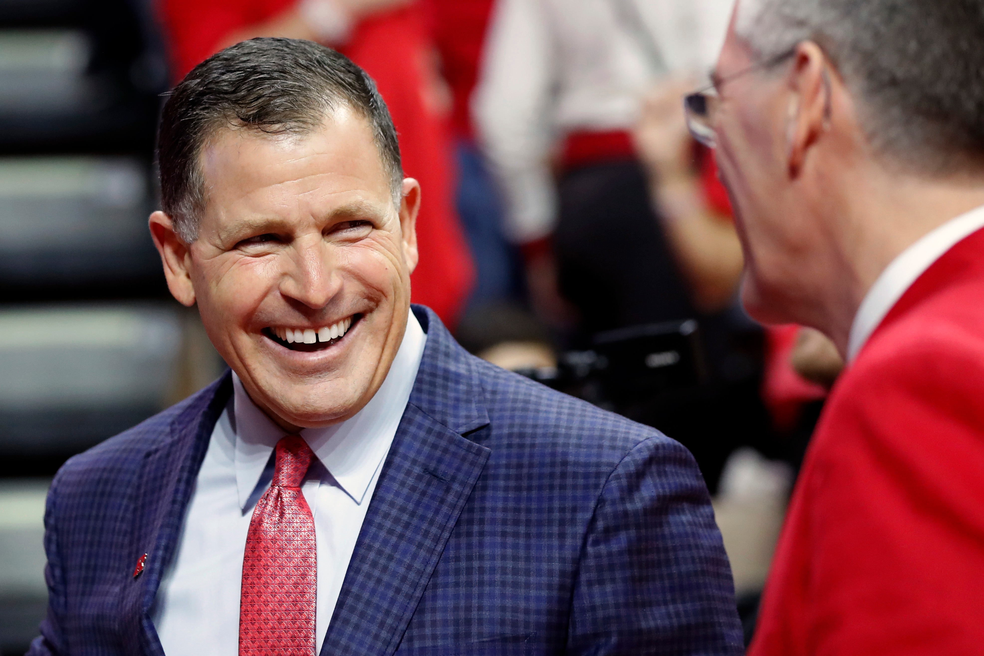 Rutgers head football coach Greg Schiano smiles as he enters the Rutgers Athletic Center (RAC) before the start of an NCAA college basketball game against Seton Hall, Saturday, Dec. 14, 2019, in Piscataway, N.J. Schiano returned to Rutgers to rebuild the school’s football program. (AP Photo/Kathy Willens) / Kathy Willens/AP