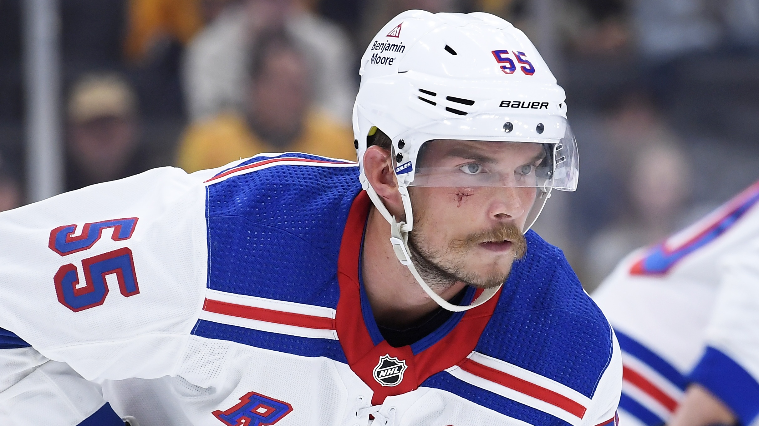 New York Rangers defenseman Ryan Lindgren (55) gets set for a face-off during the third period against the Boston Bruins at TD Garden. / Bob DeChiara - USA TODAY Sports