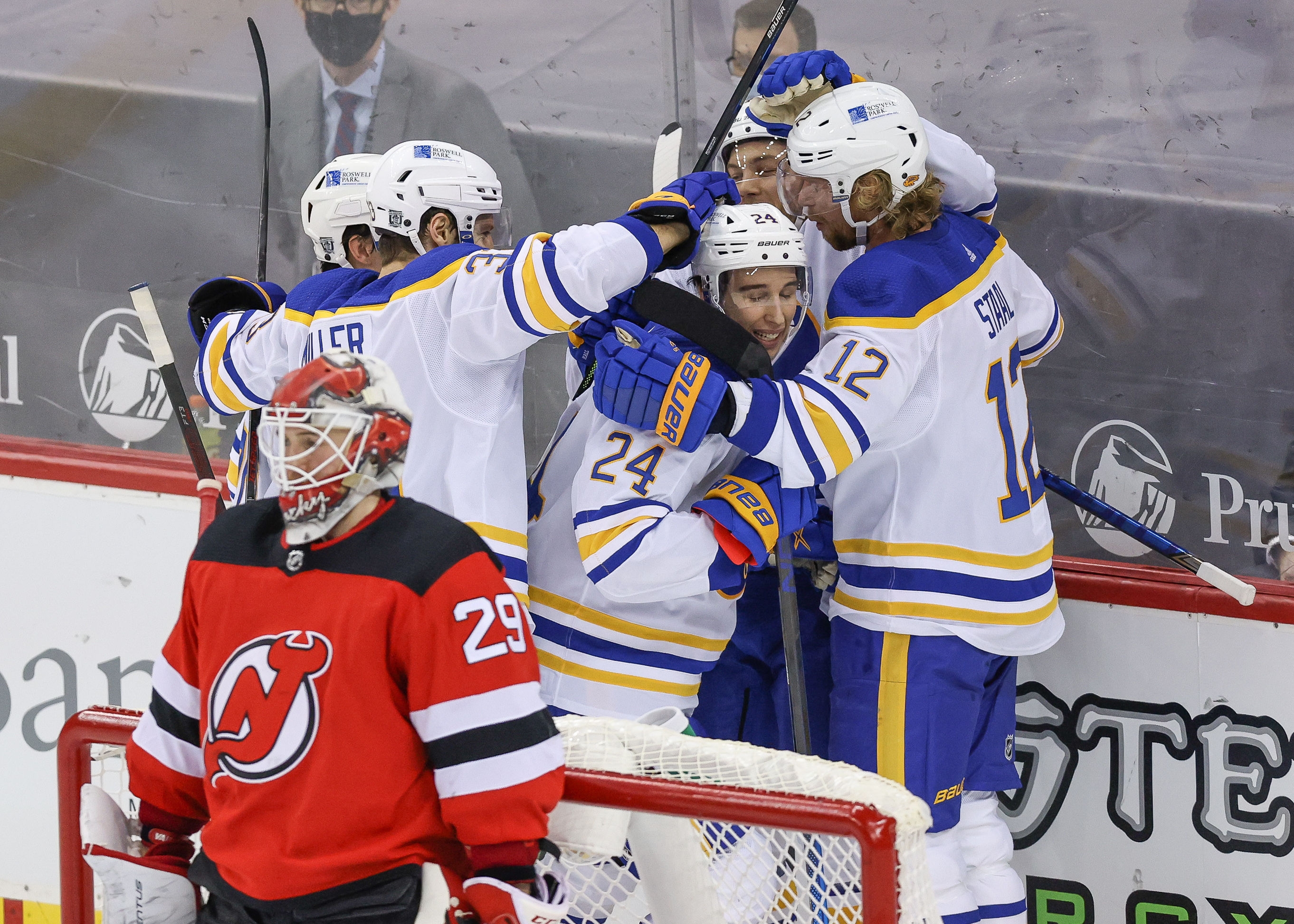 Sabres easily handle struggling Devils, 4-1Linus Ullmark saves 41 shots in the Buffalo win2/24/2021, 3:10 AMFeb 23, 2021; Newark, New Jersey, USA; Buffalo Sabres center Dylan Cozens (24) celebrates his goal past New Jersey Devils goaltender Mackenzie Blackwood (29) with teammates during the third period at Prudential Center. / © Vincent Carchietta-USA TODAY Sports
