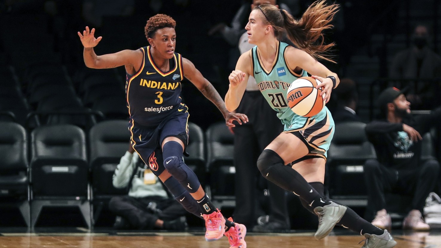 Jun 1, 2022; Brooklyn, New York, USA; New York Liberty guard Sabrina Ionescu (20) drives past Indiana Fever guard Danielle Robinson (3) in the first quarter at Barclays Center. / Wendell Cruz-USA TODAY Sports