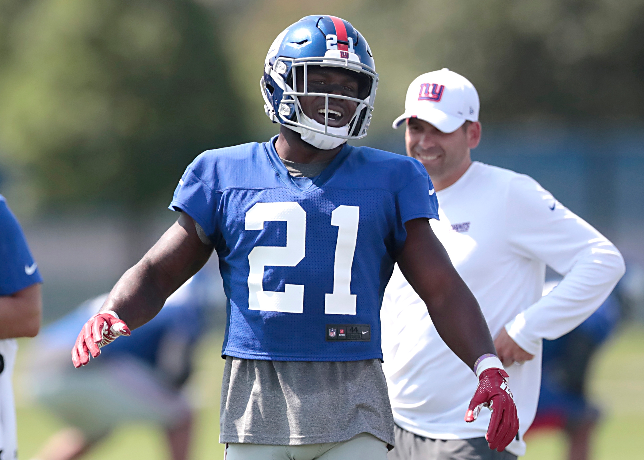Jul 25, 2019; East Rutherford, NJ, USA; New York Giants free safety Jabrill Peppers (21) reacts during the first day of training camp at Quest Diagnostics Training Center. Mandatory Credit: Vincent Carchietta-USA TODAY Sports / Vincent Carchietta