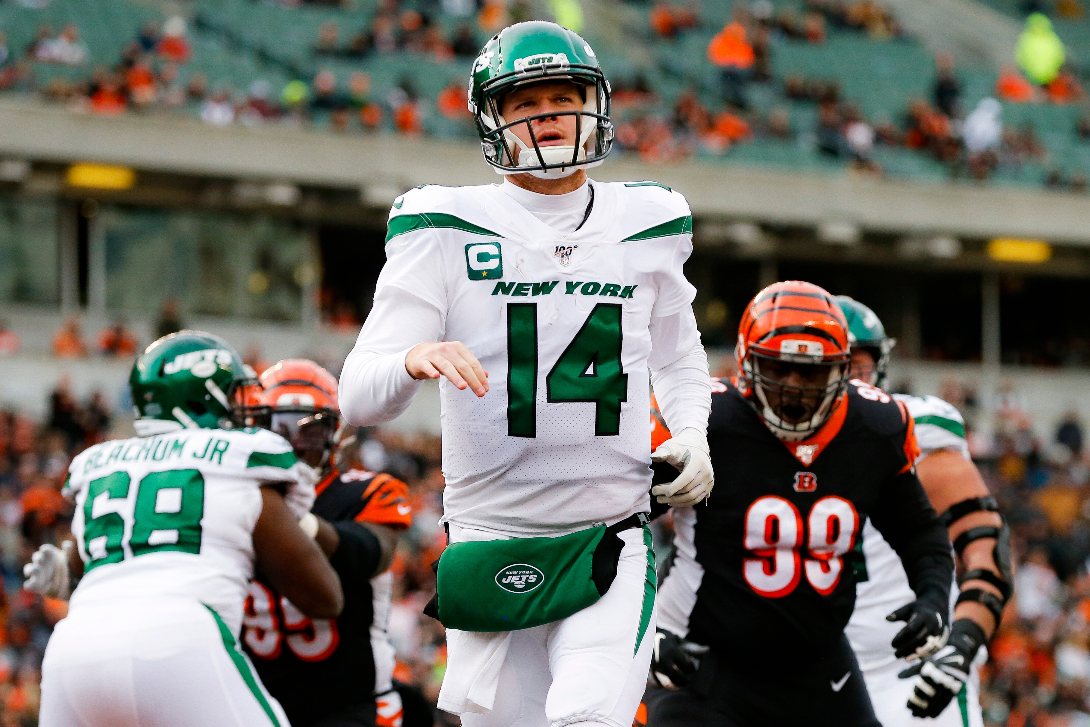 New York Jets quarterback Sam Darnold (14) reacts during the second half of an NFL football game against the Cincinnati Bengals, Sunday, Dec. 1, 2019, in Cincinnati. (AP Photo/Gary Landers) / Gary Landers/AP